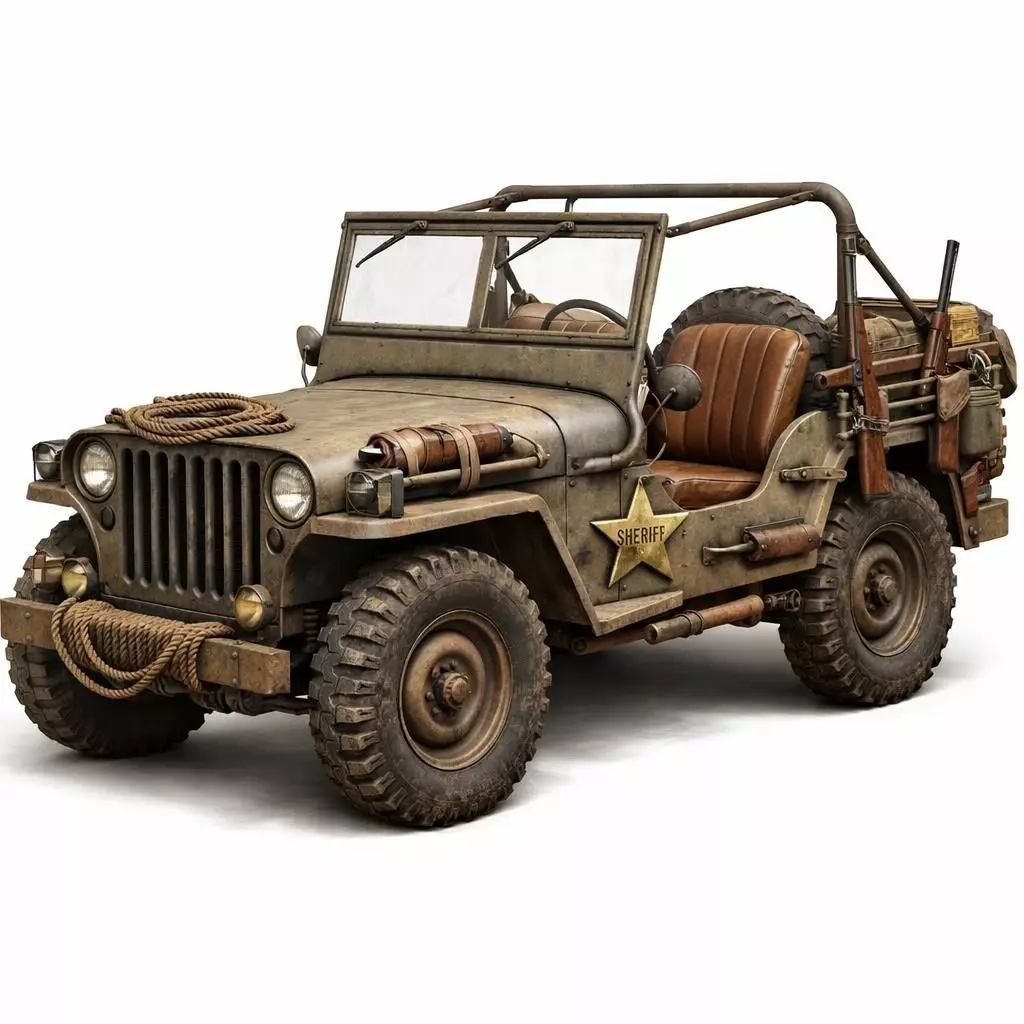Sheriff patrol jeep featuring a heavily weathered, olive-drab metal body with a rugged post-apocalyptic aesthetic. The vehicle is decorated with a dimensional brass sheriff star emblem on the side panel and includes integrated weapon racks holding classic wooden-stock rifles. It is equipped with survivalist details such as a coiled hemp lasso on the hood, a rope-wrapped front bumper, and a leather-wrapped canister mounted to the front fender. The open-top cabin features a premium tufted brown leather seat, while the rear cargo area is loaded with supply bags and a spare tire. Supported by a high-clearance chassis, the jeep sits on massive, sand-dusted off-road tires designed for desert wasteland law enforcement. This models is suitable for remesh and decimate.