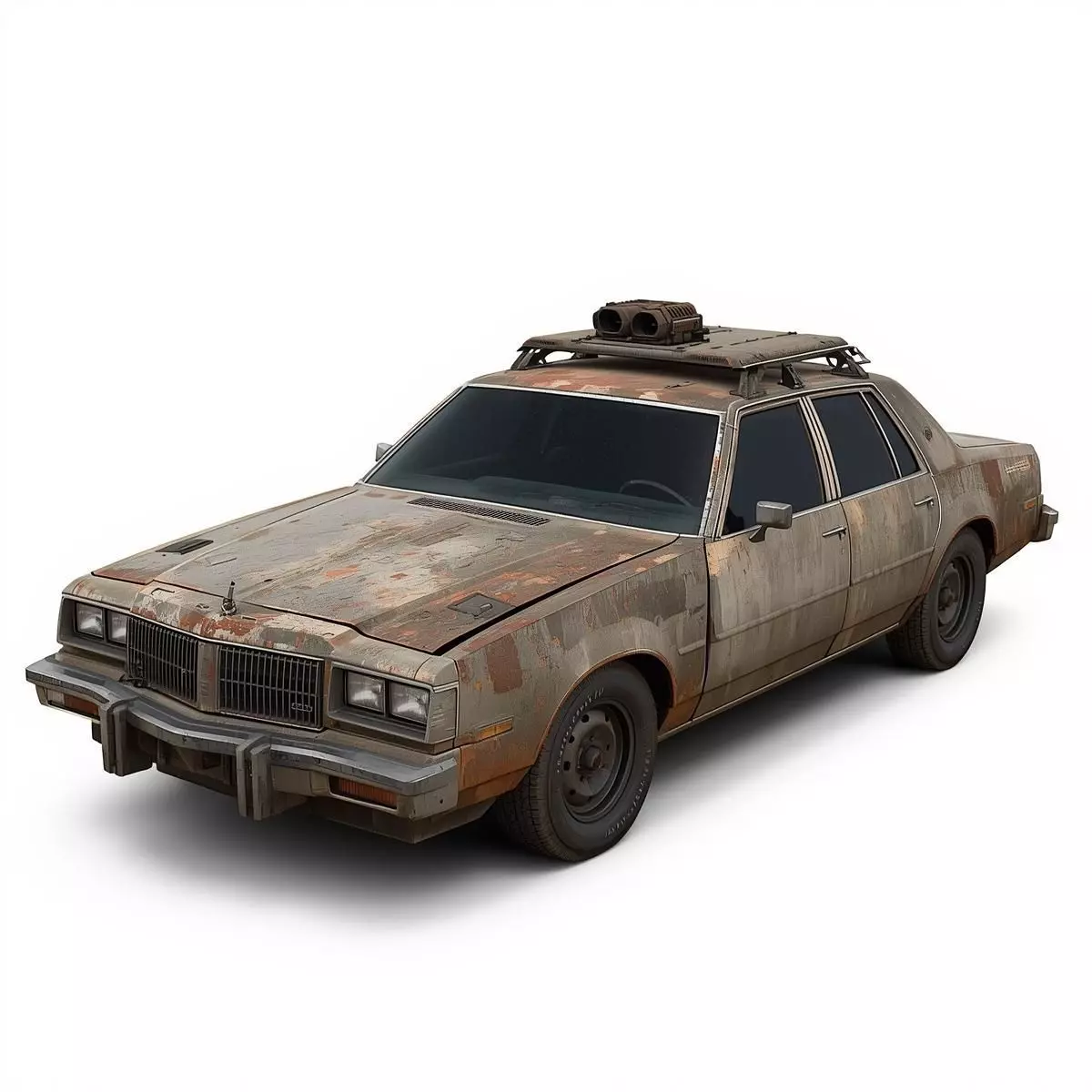 Tagsweathered car, rust, wasteland, post-apocalyptic, sedan, 3D model, PBR textures, abandoned car, survival vehicle, vintage car, derelict, game ready
