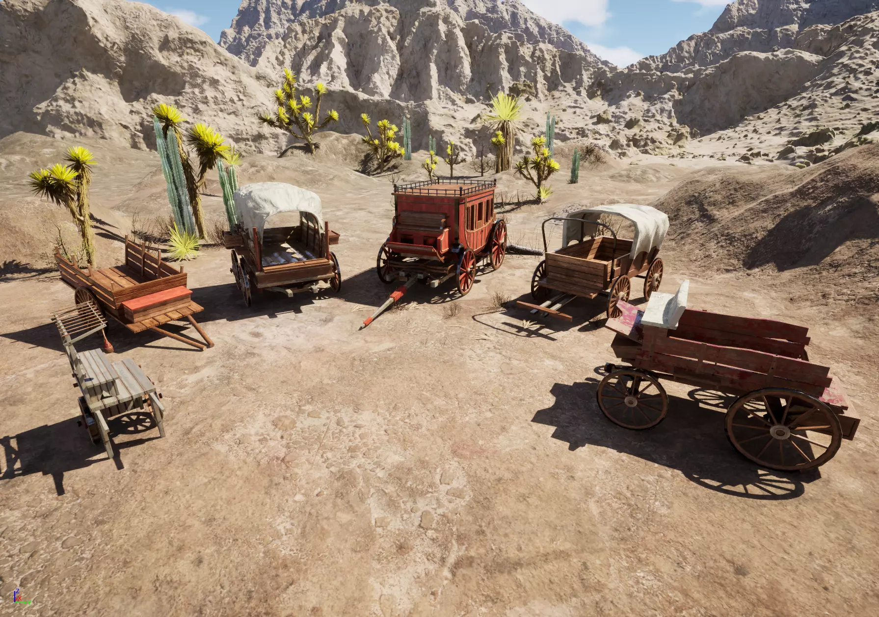 Bring authentic Old West atmosphere to your project with this Wild West Wagon Pack.This collection includes multiple modular horse-drawn wagons and carts inspired by classic western environments, perfect for games, cinematics, VR/AR, and real-time applications.