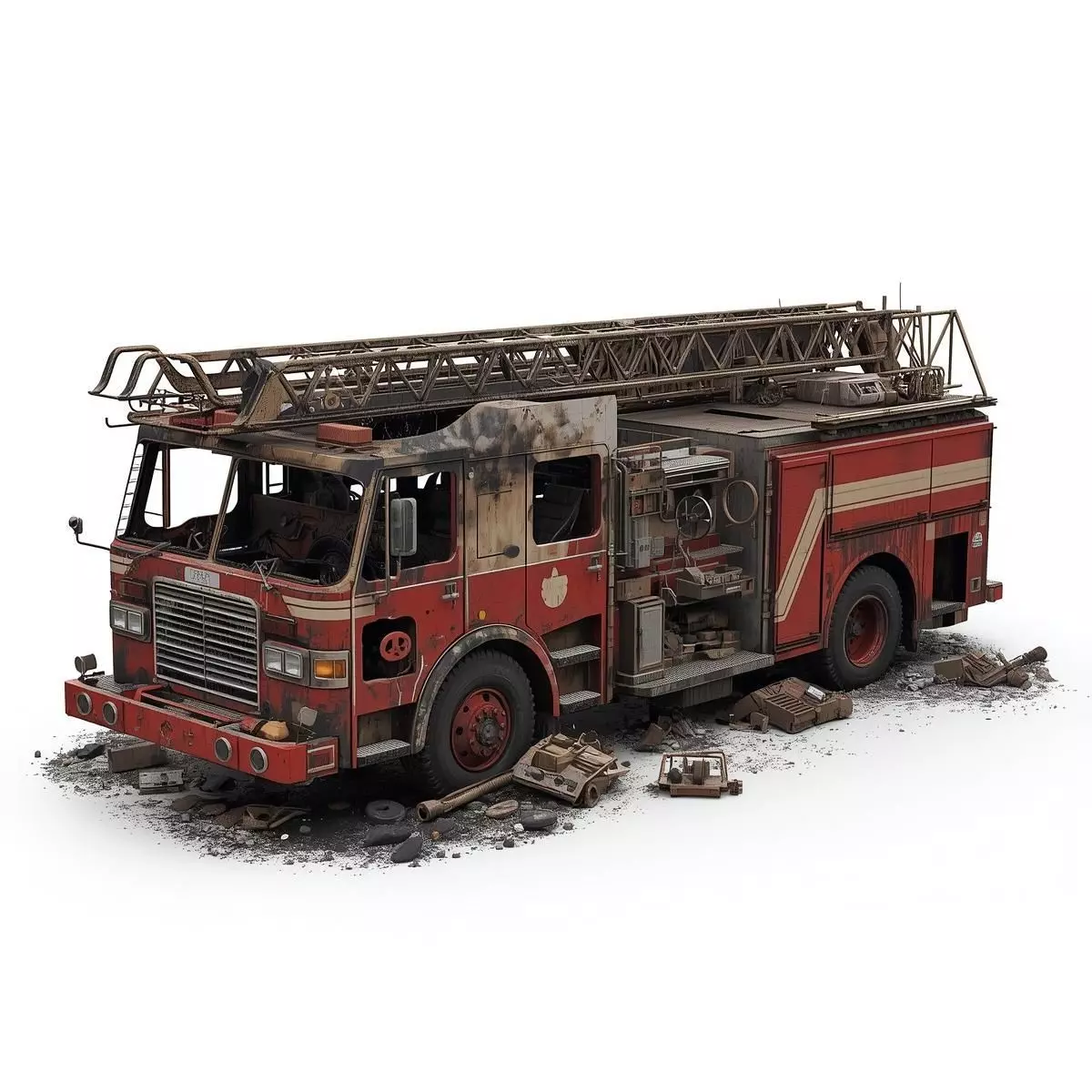 This high-quality 3D model features an abandoned and heavily damaged fire truck. The design emphasizes urban decay, featuring a rusted ladder assembly, smashed windows, and exposed internal utility sections. It is perfect for professional environmental storytelling in war-torn or post-catastrophic game levels.