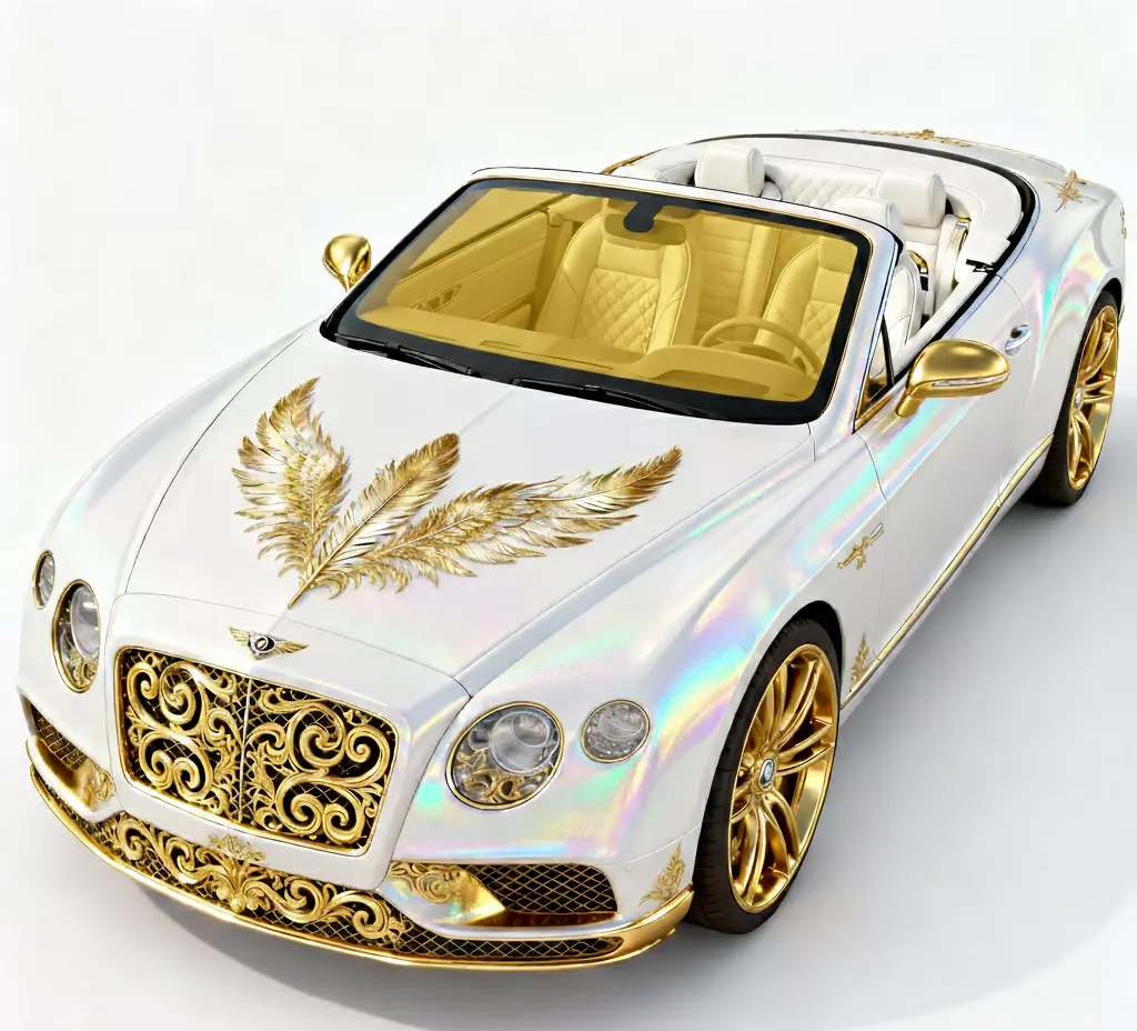 Ornate Gold Filigree The front of the vehicle is dominated by intricate 24k gold scrollwork. The front grille is replaced by a custom-carved baroque pattern, and the lower bumper features matching gold trim. The most striking feature is the triple-feather emblem embossed on the hood, suggesting speed, light, and grace.