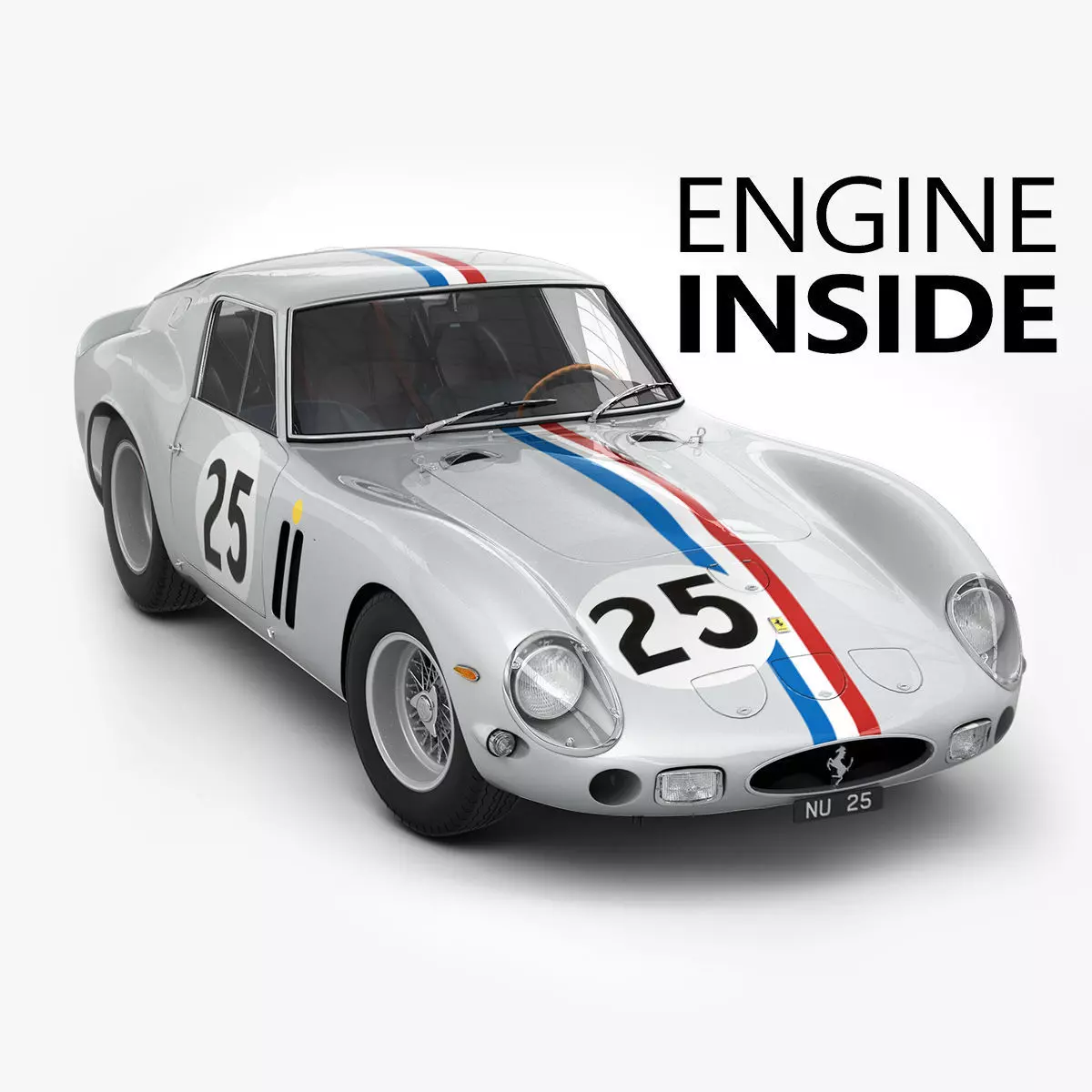 DESCRIPTION: This is a very detailed 3d model of the 1963 Ferrari 250 GTO serial number 4153GT. Includes 2 different liveries, the silver/yellow and the silver/le mans one. Just replace the original textures with the Le Mans livery zip archive textures.