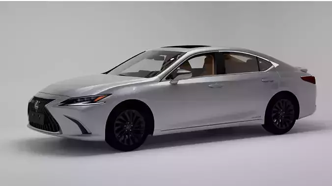 • This is a high-quality 3D render of a Lexus ES 300h, showcasing the car’s elegant and aerodynamic sedan design. The model features the signature Lexus spindle grille, sharp LED headlights, and smooth body lines. The exterior appears in a metallic light-silver finish with black multi-spoke wheels, while the interior is designed in a warm brown leather tone. The lighting setup is soft and studio-style, highlighting the reflections and clean geometry of the vehicle. This render emphasizes the luxury, hybrid identity, and premium craftsmanship of the ES 300h.