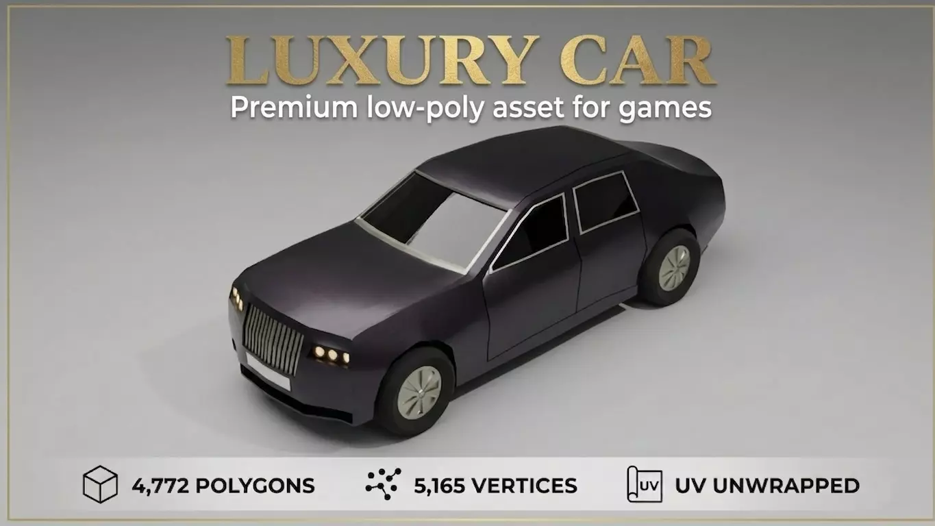 This low-poly 3D model of a luxury car masterfully balances performance efficiency with high-end aesthetic appeal, making it an ideal asset for real-time applications such as mobile games, VR/AR environments, or architectural visualizations. Despite its economical geometry—boasting a lean count of 4,772 polygons and 5,165 vertices—the model maintains a commanding presence through its sharp, deliberate lines and classic sedan silhouette. The design draws inspiration from prestigious luxury marques, featuring a prominent vertical slat grille, triple-cluster headlights, and a sophisticated deep-purple metallic finish that reacts realistically to ambient lighting.