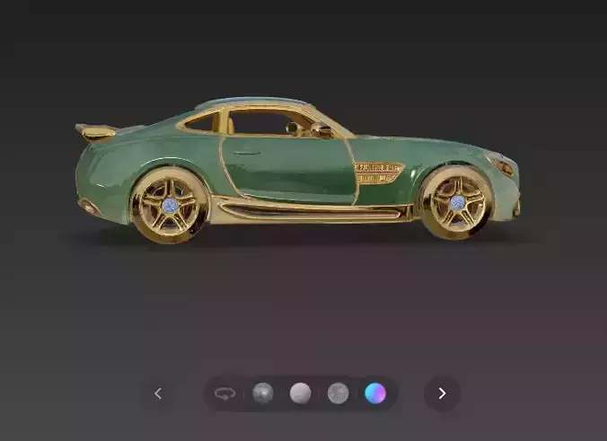A stunning, high-poly 3D representation of the Mercedes-Benz AMG GT styled as a luxury Jeweled Edition. This model features a unique aesthetic combination of polished green jade/marble bodywork and 24k gold chrome accents on the wheels, grille, and trim. It is perfect for luxury product visualization, high-end interior decor renders, or cinematic close-ups.