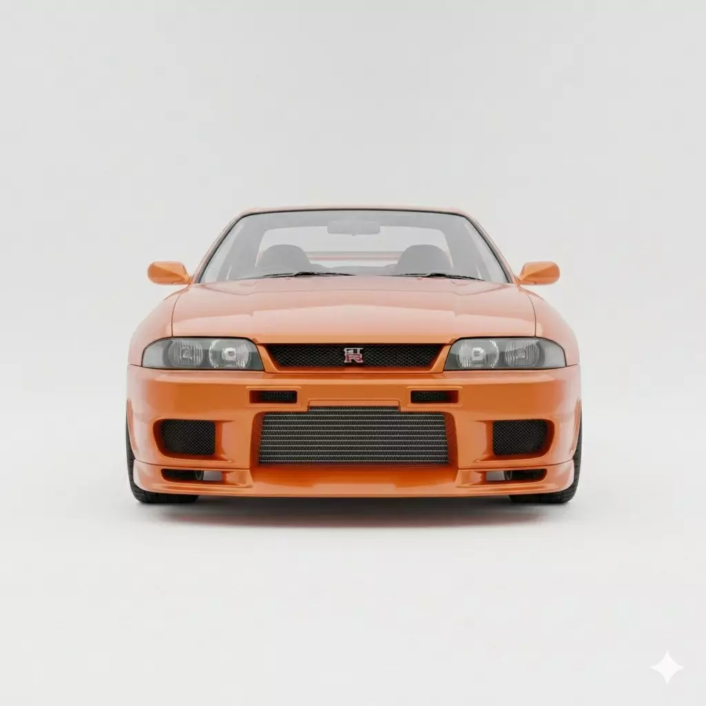 This highly detailed 3D model features the legendary Nissan Skyline GT-R (R33), the middle child of the modern GT-R era, presented in a vibrant Sunset Orange Metallic finish. The model showcases several tasteful performance modifications, including an aggressive front bumper with enlarged air intakes for the visible front-mounted intercooler and an integrated splitter. The vehicle sits on five-spoke deep-dish silver alloy wheels that emphasize its muscular stance. Precision-rendered details include the iconic GT-R badge on the horizontal mesh grille, sleek aerodynamic side mirrors, and the signature adjustable rear wing. The high-fidelity textures and accurate geometry make this asset a perfect choice for urban racing environments, automotive enthusiast galleries, or high-end cinematic sequences exploring 90s JDM culture.