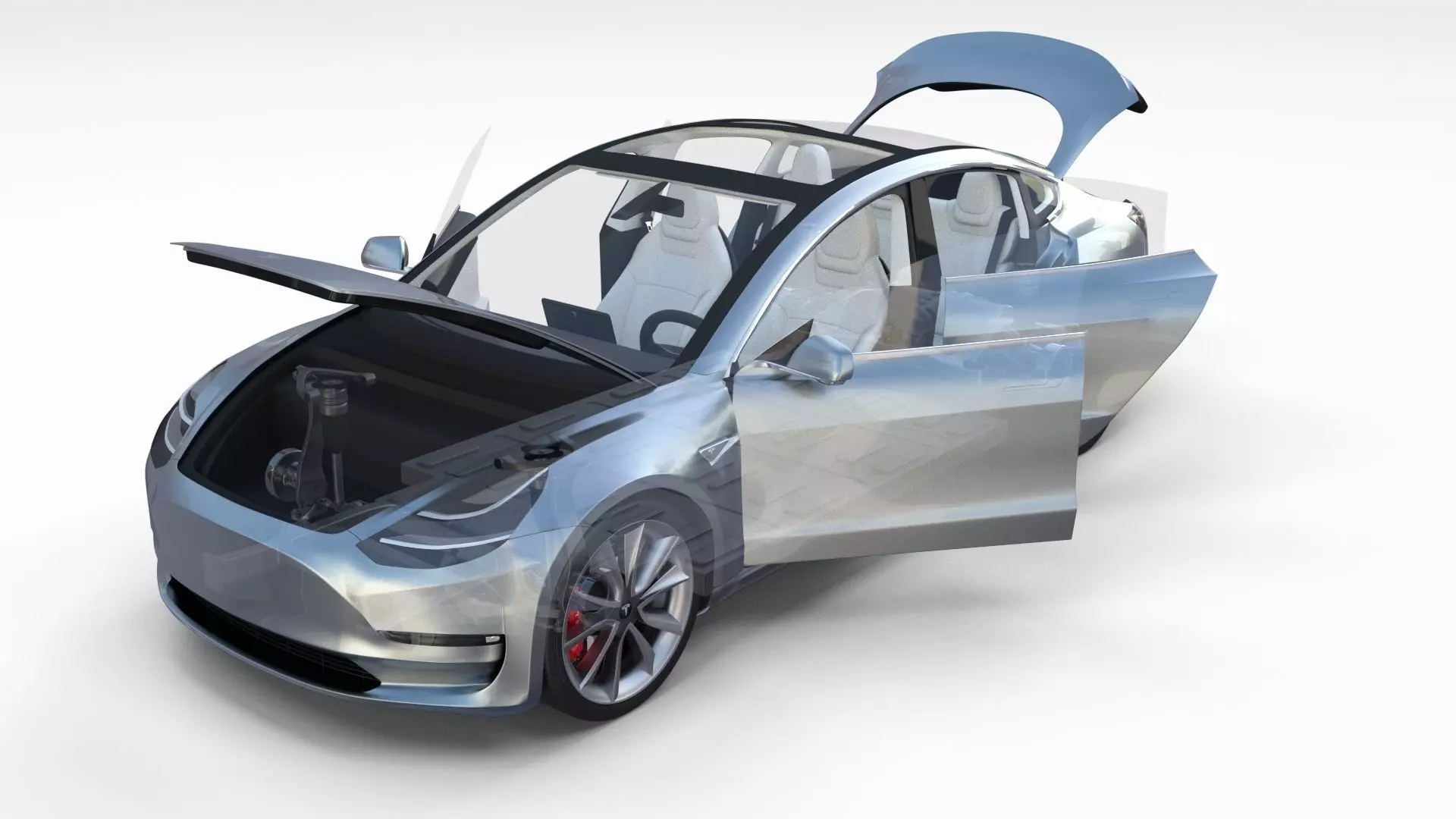 A very accurate model of a Tesla Model 3 with a HIGHLY DETAILED INTERIOR AND CHASSIS, WITH ENGINE, SUSPENSION AND BRAKES MODELED.