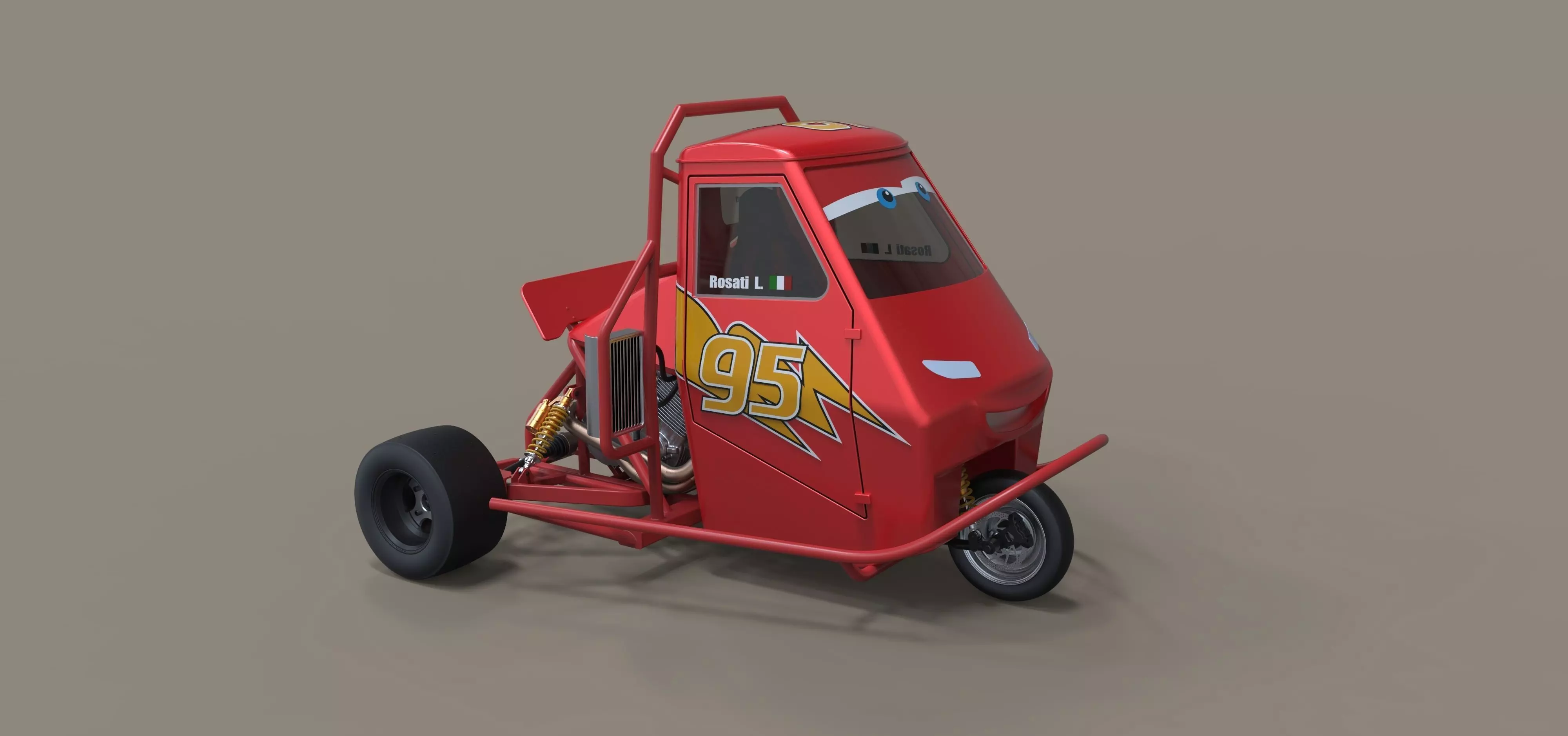 Loris Rosati built and races in his modified Piaggio Ape. The Piaggio Ape started being built in 1948 and over the years different models came with gasoline and diesel engines ranging from 50 cc to 422 cc. Whatever engine originally came in Loris’ Ape it wasn’t powerful enough so he replaced it with a 599 cc inline-four from a Honda CB600F (Hornet) that makes 94-102 horsepower and 46 lb-ft of torque.Model dimensions: