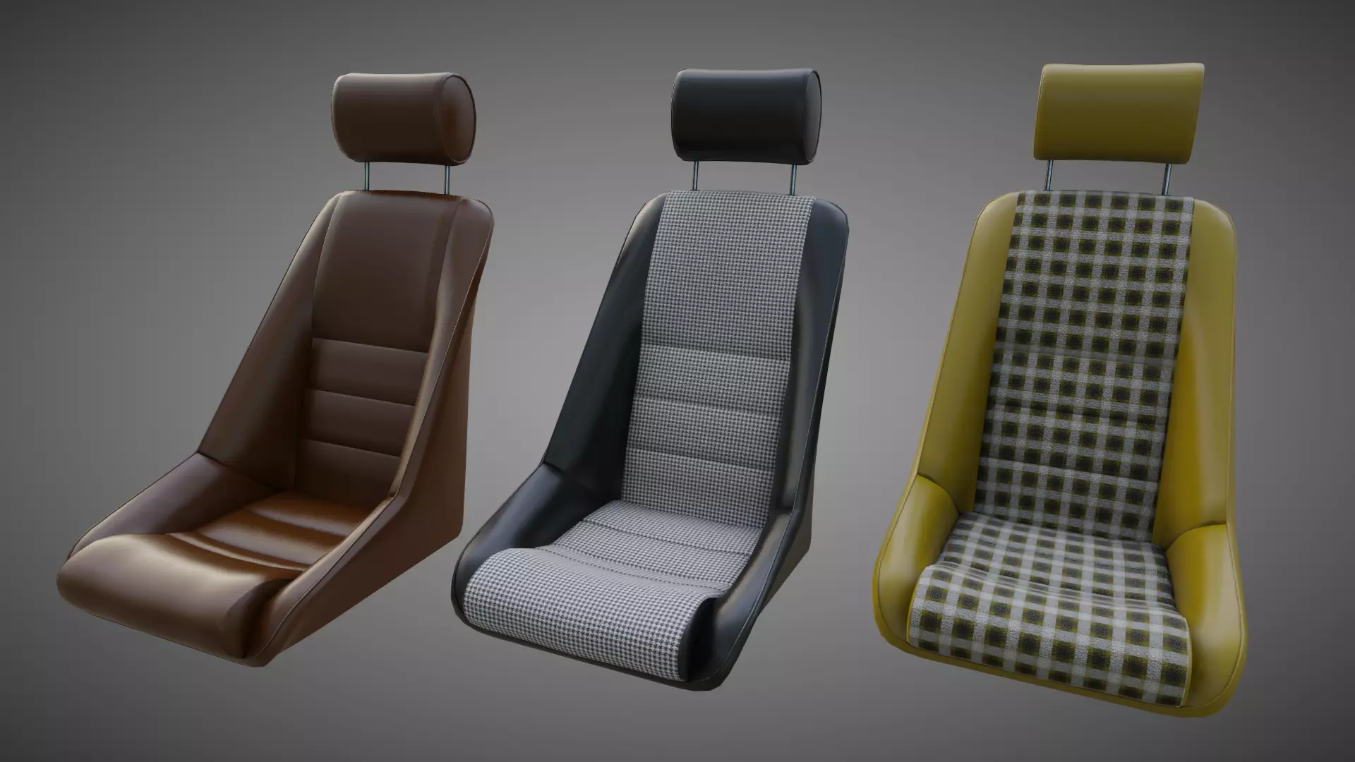 The BF Nürburgring sport seats I made for the 911 Backdate model ( https://www.cgtrader.com/3d-models/car/concept-car/porsche-911-backdate-targa ). You can of course use it universally where you want. In leather, pepita and tartan variants.Midpoly, PBR, short animation to show the simple headrest rig (in blender file and FBX). All textures are 2K, one set per seat.