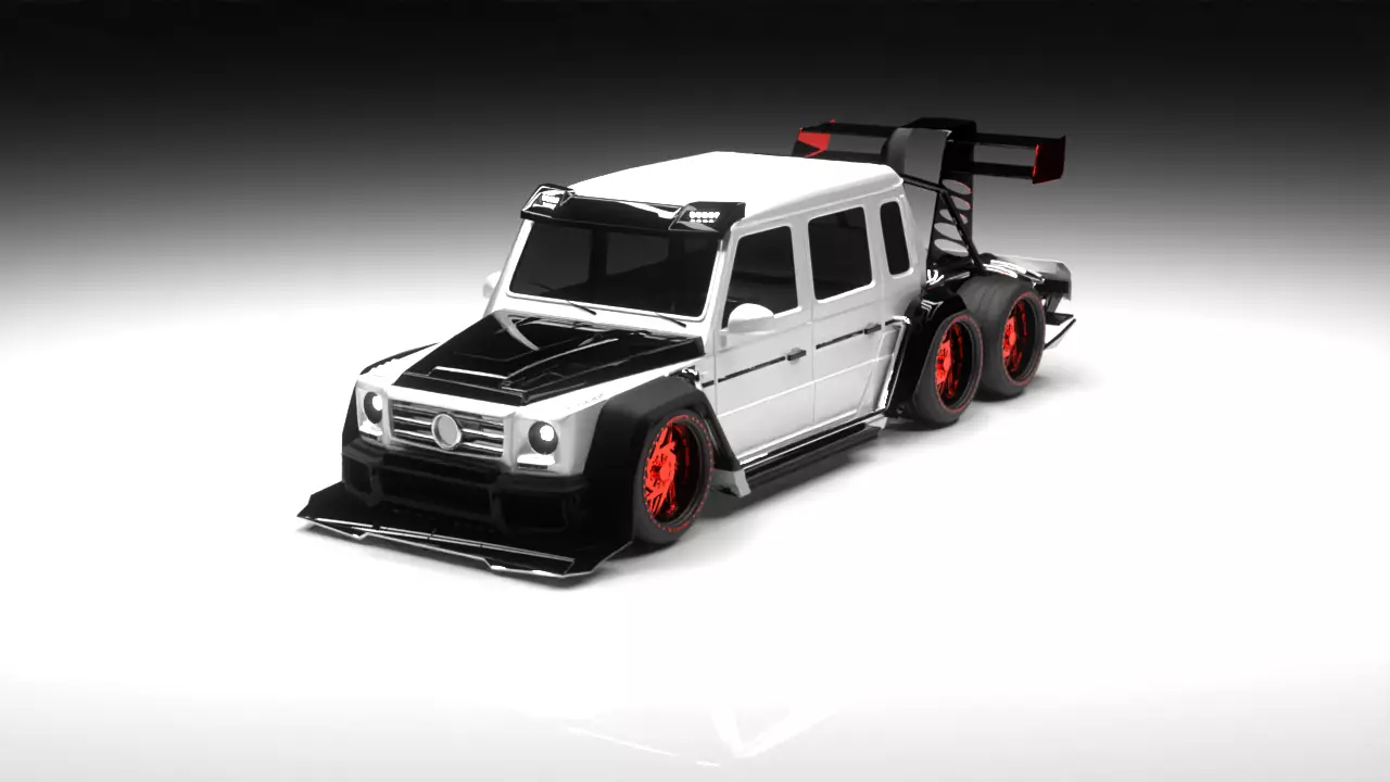 Presenting a highly detailed and stylized Mercedes-Benz G63 6x6 AMG Widebody custom build, modeled in Blender 3.6.This aggressive cyber-inspired take on the legendary G-Wagon features a massive widebody kit, extreme low stance, huge rear spoiler with functional aerodynamics, dual rear axle setup, and striking black & white livery with glowing red accents. Perfect for high-end rendering, animation, games, or automotive visualization projects.Key Features: