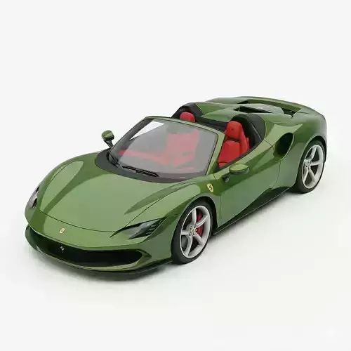 This is a photorealistic 3D model render of the 2025 Ferrari 12Cilindri Spider Concept, Ferrari's latest V12-powered, front-mid-engined grand tourer. The model is finished in a sophisticated, deep metallic green color, which is a nod to a custom or heritage shade like Verde Toscana, a color specifically featured on the press cars. The vehicle is depicted as a convertible (Spider) with the retractable hardtop down, showcasing the futuristic dual-cockpit interior rendered in a vibrant red leather upholstery. The design emphasizes aerodynamic efficiency with its long hood, clean flanks, and distinct flying buttresses over the rear deck. This high-quality asset accurately captures the 12Cilindri's sleek, modern styling and would be perfect for high-end automotive visualization, marketing, or use in premium racing and simulation games.