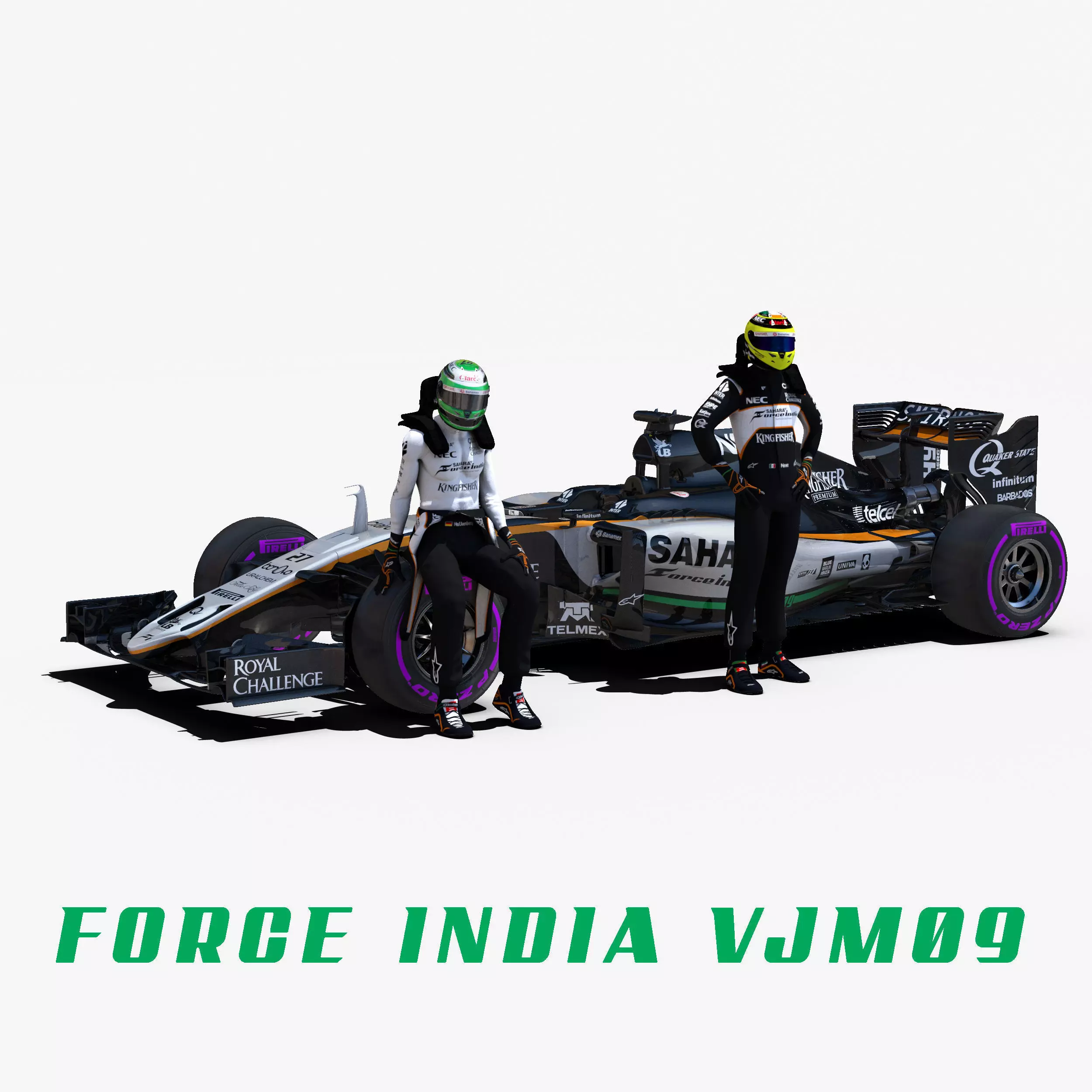 This is a 3D low poly model ,it was designed to provide a high definition in a low poly. Standard low-poly mesh with specific poly count. It`s the most accurate and realistic Force India VJM09 of the market. It has all of details of VJM09 model. Rigged in the maya version. This is a recreation of Force India VJM09 model,it can suffer modification over the season. Included all types os wheels, Sergio Perez and Nico Hulkenberg, theirs helmets and the steering wheel. The model is completely ready for use visualization in maya. For low poly model simply press 1 and for the high resolution press 3. In Cinema4d go to function menu and subdivide. In 3dmax meshsmooth In the low poly: Poly count : 78432 Vertex count : 82467 In the high poly: Poly count : 1484320 Vertex count : 1300285 Textures included. Each texture is in jpg format and have a 4K texture resolution for high quality It has three UV textures, one for the car , other for the tires and the last one for the driver. It has color textures, specular textures, displacement textures,bump textures. The files are obj, fbx, mb ,c4d and 3DS. Included 7 different poses of each driver. In formats c4d, 3ds, obj and fbx model exported to standard materials (textures), not contain mental ray shaders. files with the model does not contain extraneous or hidden objects (lights, cameras, etc.) Included rigging and constrains, blend shapes and driven keys only in the maya format. In the maya format you can easily change the wheels, the pilot and the DRS(open and close). original file format maya render in linear sRGB
