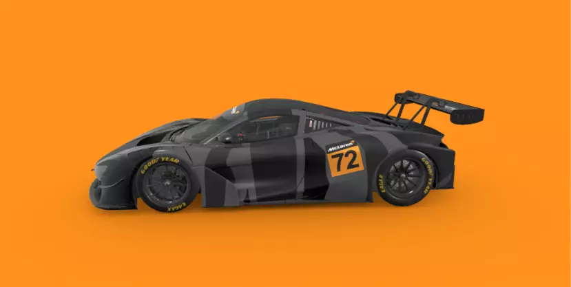 This 3D model represents a McLaren GT3-inspired racing machine, finished in a stealthy matte black camo livery with bold orange accents and car number 72. Designed with meticulous attention to motorsport detail, the model features a large aerodynamic rear wing, aggressive front splitter, race-ready vents, and Goodyear Eagle racing slick tires. The interior cockpit is equipped with a detailed racing seat and roll cage.