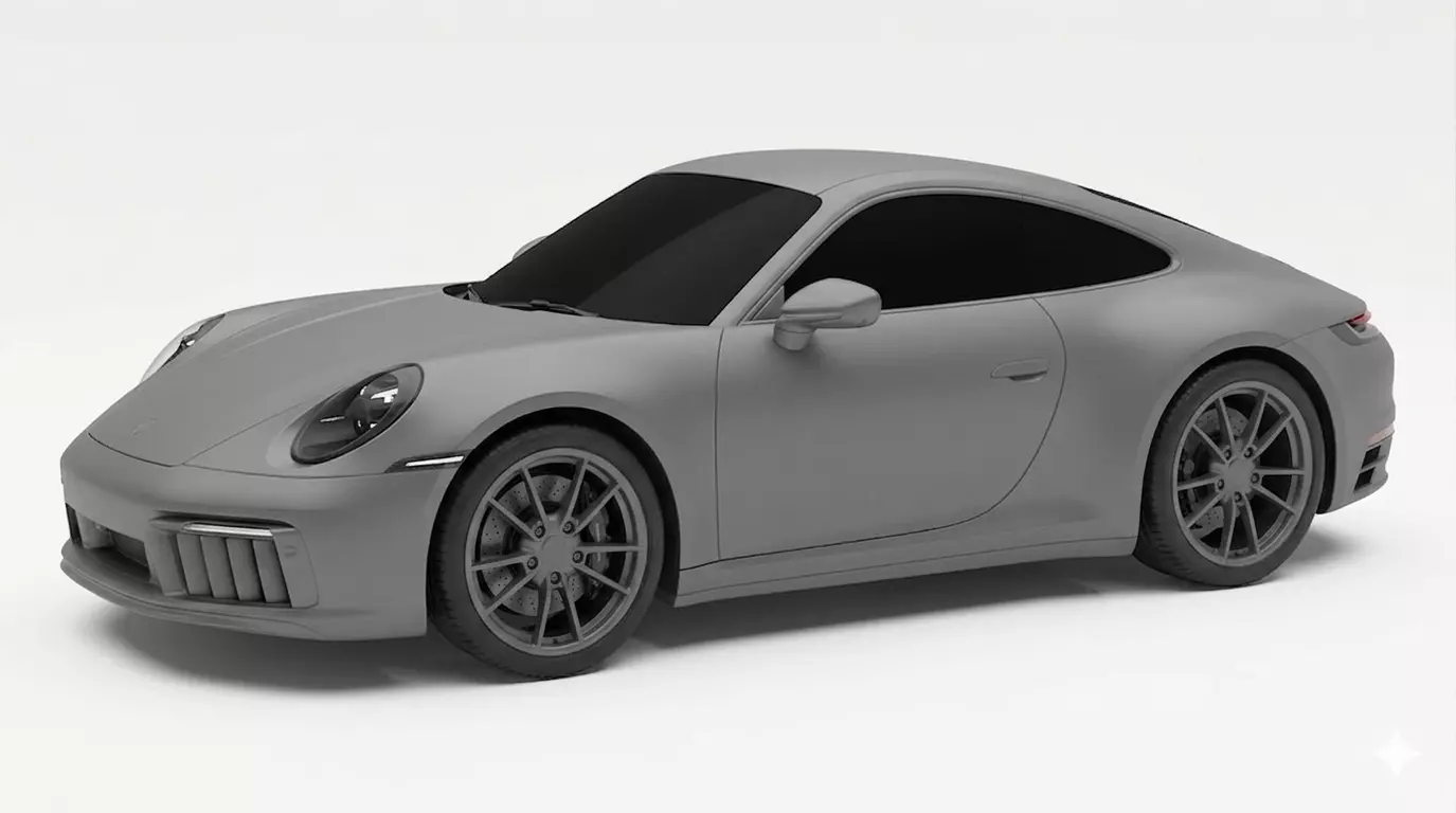 This image showcases a high-quality 3D render of a contemporary sports car, heavily inspired by the iconic silhouettes of high-performance German engineering. Presented in a sophisticated, monochromatic matte grey finish, the vehicle features a streamlined aerodynamic profile with a low-slung stance and distinctive wide rear haunches. The front fascia is defined by recessed circular LED headlights and aggressive vertical air intakes, while the dark-tinted windows add an air of mystery and luxury. Set against a clean, neutral white background, this studio-style visualization emphasizes the car's clean lines, precision panel gaps, and intricate multi-spoke alloy wheels, making it an ideal representation of modern automotive design and digital modeling craftsmanship.