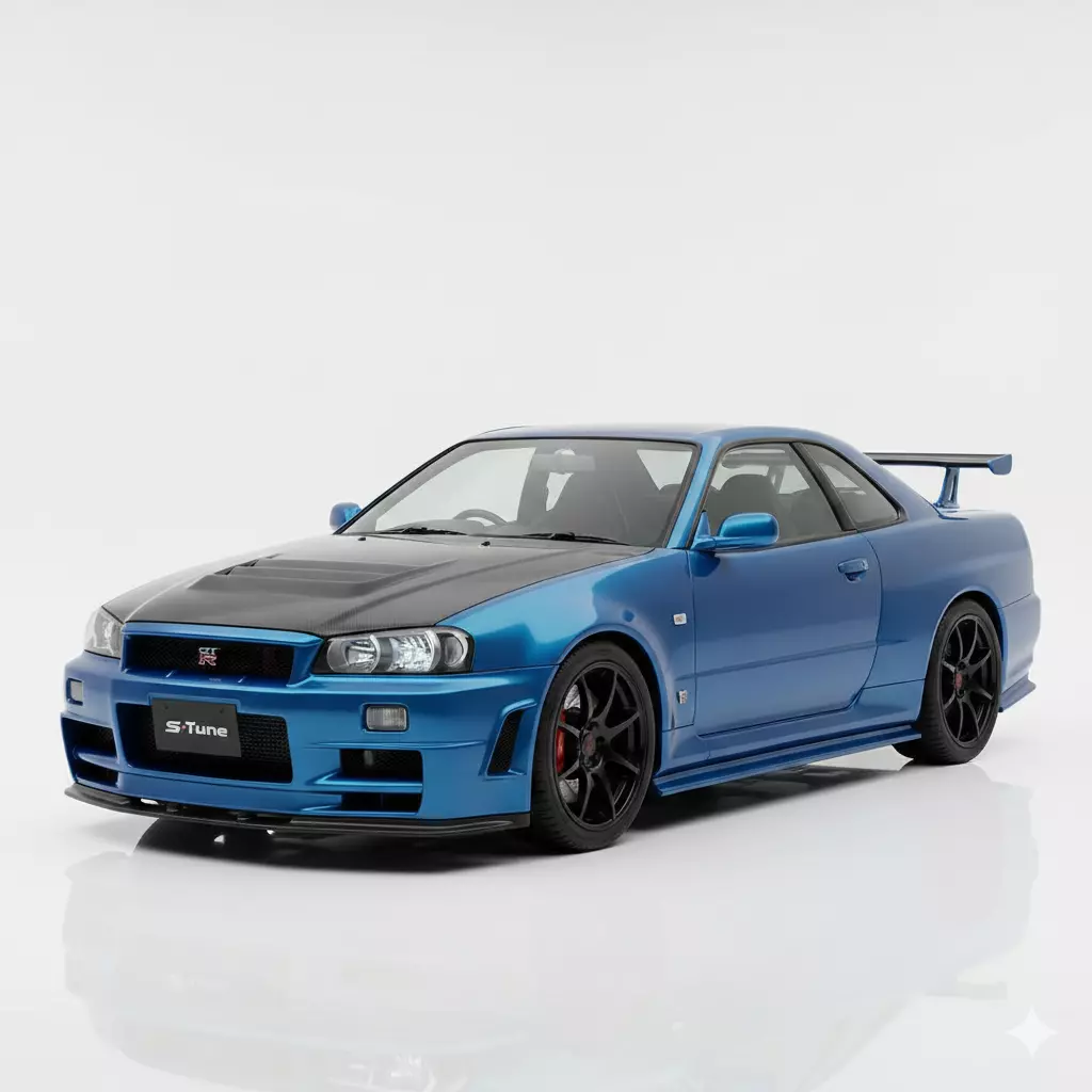 This high-fidelity 3D model depicts the legendary Nissan Skyline GT-R (R34) in the iconic S-Tune configuration. The vehicle is finished in the classic Bayside Blue metallic paint, contrasted by a lightweight carbon fiber vented hood and an aggressive Nismo-style front bumper. This specific version features the S-Tune front license plate and a visible high-performance intercooler behind the lower grille. The side profile showcases deep-dish black multi-spoke racing wheels paired with red performance brake calipers. Complete with its signature rear wing and quad circular LED taillight housings, this asset is an essential for JDM-themed racing projects, automotive lifestyle renders, and digital twin showcases of 90s tuning culture.