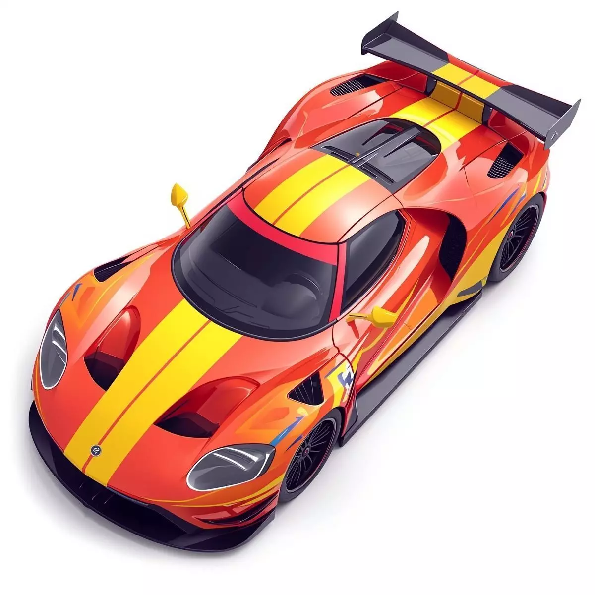 Vibrant orange and red gradient paint job with high contrast yellow racing stripes