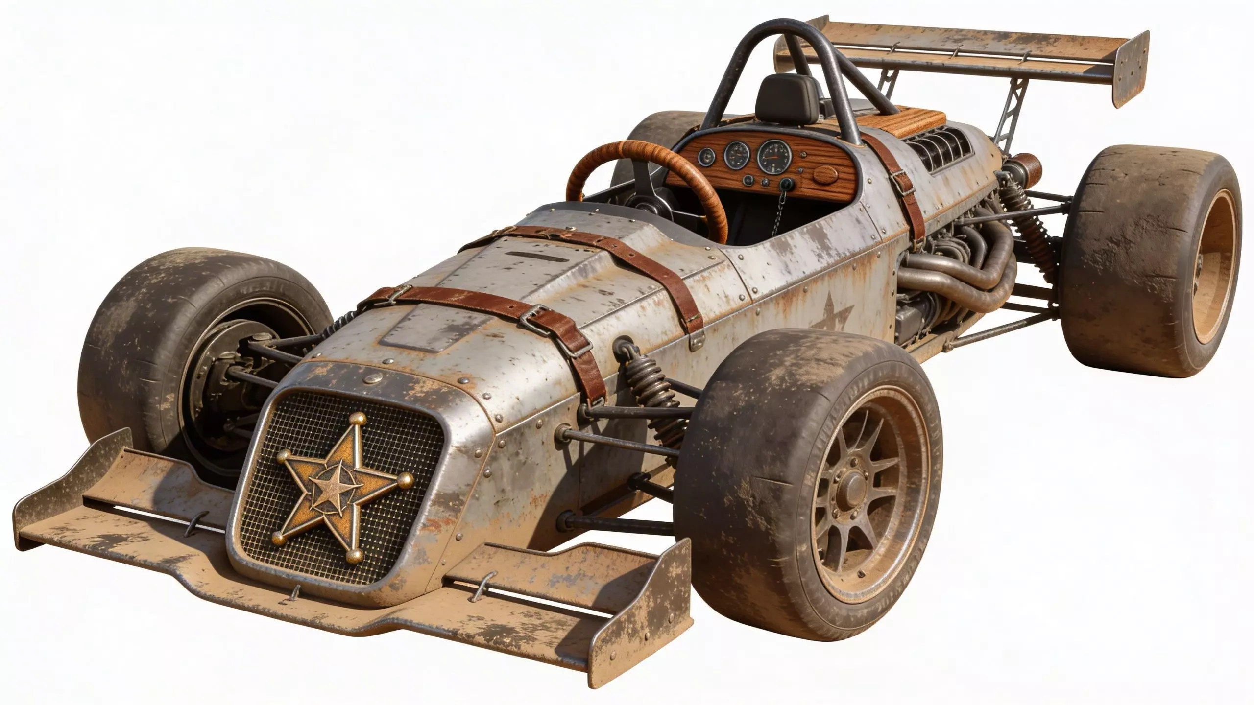 Formula-style racing car featuring a unique blend of high-speed aerodynamics and Wild West survivalist aesthetics. The vehicle is constructed with dusty, riveted metal panels held together by leather belts and buckles. It features a prominent brass sheriff star emblem on the front grille and a wooden dashboard equipped with retro analog gauges. The open-cockpit design includes a leather-wrapped steering wheel and a heavy-duty roll hoop. Supported by an exposed suspension system with visible coil springs, the racer sits on wide, sand-covered slick tires, making it a perfect asset for desert racing or wasteland pursuit scenes. This models is suitable for remesh and decimate.