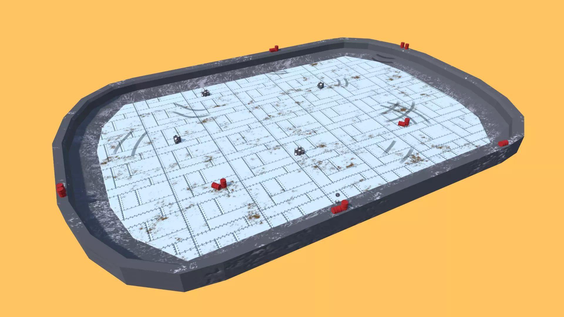 Low-poly style racing arena. It is a game-ready asset with a low polygon count to be used in demolition derbies or races, Blur or flat-out style games. It has damage and rust. The wheels and barrels as probs are in different groups and also available in Unity package, so just click and drag to use them or not in the game. You can see the Car Models with the Weapons in the pack.
