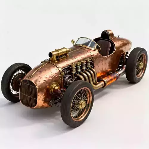 The Overall Concept This asset is a high-speed racing car from an alternate Steampunk past. It combines the sleek, cigar-shaped body of a 1930s Grand Prix racer with raw industrial materials like copper and brass.