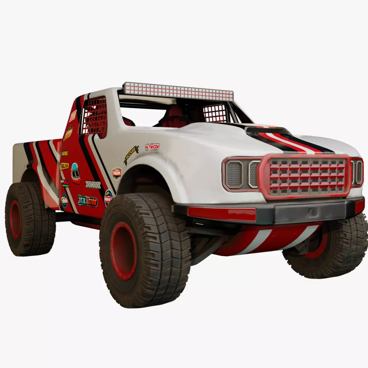 3d model of a sleek trophy truck with a vibrant red and white color scheme, adorned with sponsor logos along the sides.The model comes with 1-4k resolution texture packs.