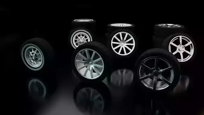 Este es un pack de 3 ruedas. El pack contiene tres llantas de diferentes estilos y tres neumaticos diferentes. Estos modelos estan hechos en Autodesk Maya 2002 y renderizados con Arnold 5.2.2. Este pack es perfecto para añadirle ruedas a tu modelo de coche 3D o como decoracion para una escena de garaje.