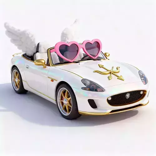 The Overall Concept The asset blends modern luxury automotive design with classical Cupid iconography. It is a sleek, white convertible roadster featuring angelic wings and archery-inspired accents, symbolizing love in the fast lane.