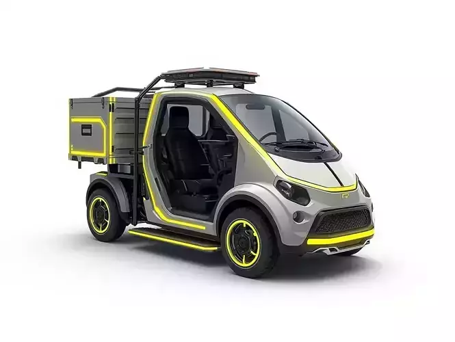 Futuristic Compact Utility Vehicle 3D ModelDescriptionThis 3D model features a compact, futuristic electric utility vehicle (EUV) designed for urban logistics or personal transport in a high-tech setting. It combines the functionality of a small pickup or cargo vehicle with a minimalist, modern aesthetic.