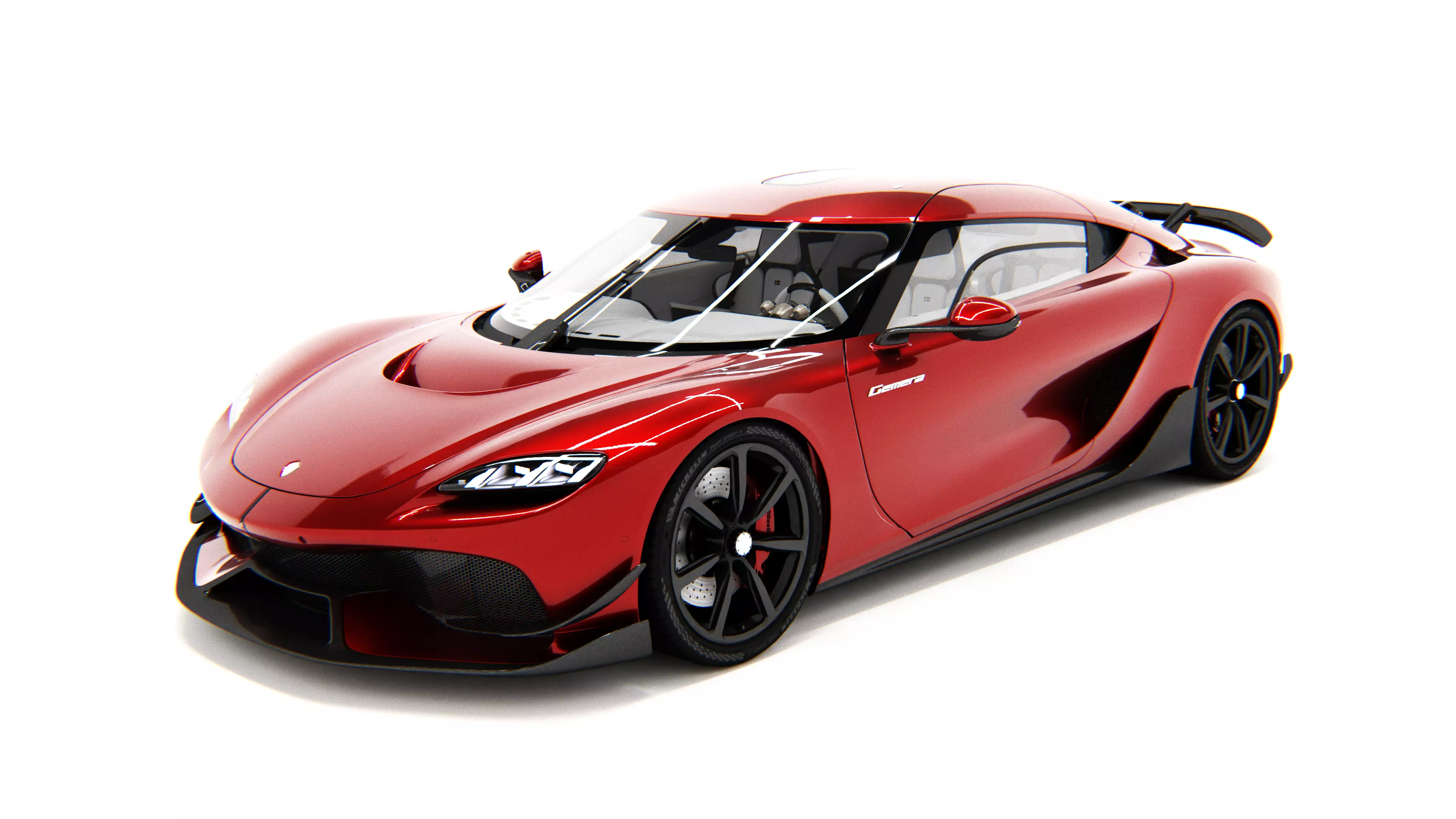 • This 3D model captures the Gemera’s sleek aerodynamic body, aggressive front fascia, and signature Koenigsegg styling. The car features a carbon-fiber monocoque structure, smooth flowing lines, and detailed interior elements designed for four passengers.