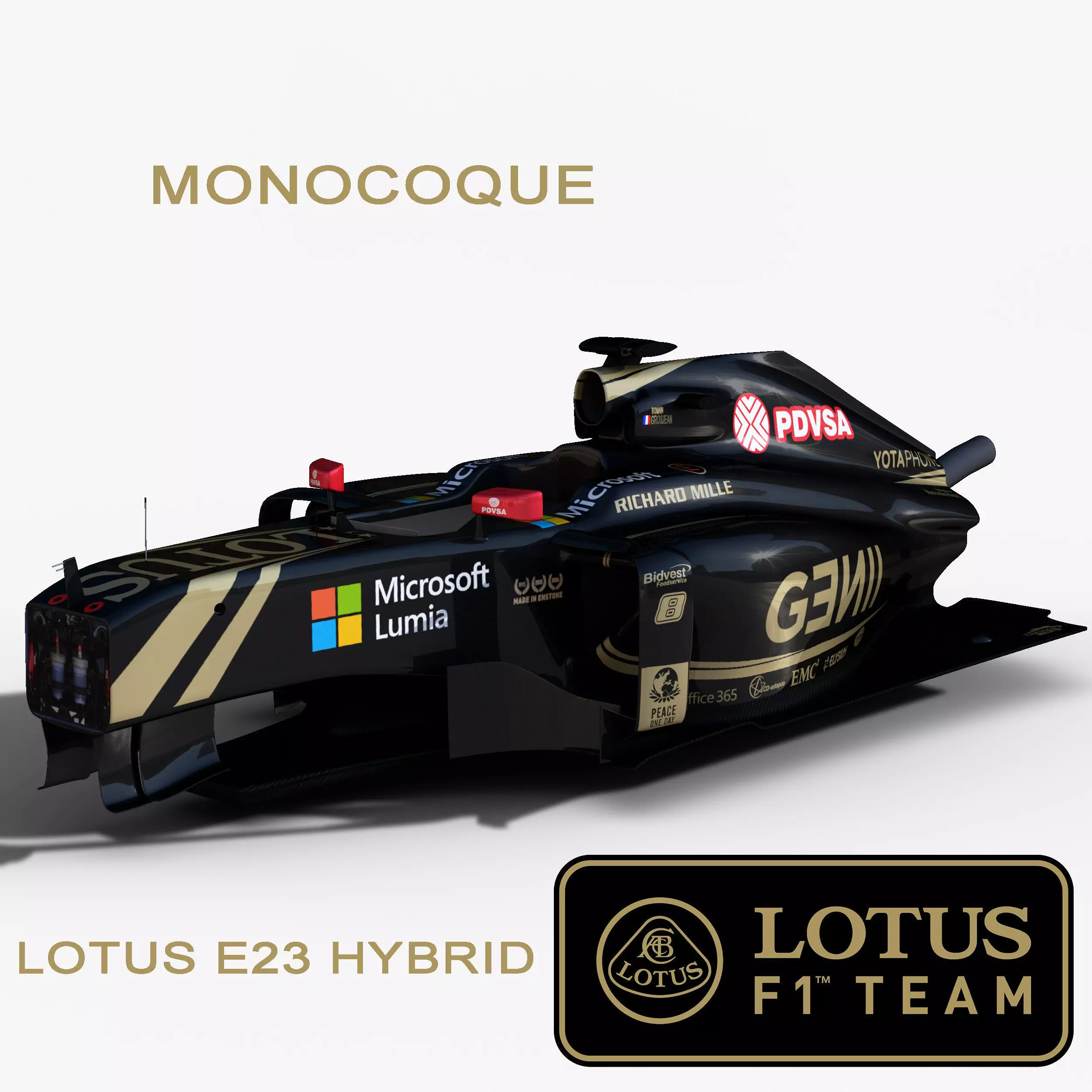 This is a 3D low poly model ,it was designed to provide a high definition in a low poly. Standard low-poly mesh with specific poly count. It`s the most accurate and realistic monocoque of the Lotus E23 Hybrid of the market.It has all of details of E23 monocoque it can suffer modification over the season.The model is completely ready for use visualization in maya. For low poly model simply press 1 and for the high resolution press 3. In Cinema4d go to function menu and subdivide. In 3dmax meshsmoothIn the low poly: Poly count : 7774Vertex count : 8185In the high poly: Poly count : 124392Vertex count : 125948Textures included. Each texture is in jpg format and have a 4K texture resolution for high quality The files are obj, fbx, mb ,c4d ,dad, and 3DS.In formats c4d, 3ds,dae , obj and fbx model exported to standard materials (textures), not contain mental ray shaders. files with the model does not contain extraneous or hidden objects (lights, cameras, etc.) original file format mayaRender in linear sRGB