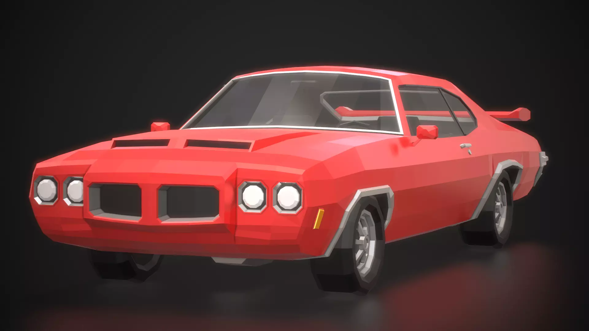 Stylized low-poly model inspired by the design of American muscle cars of the 70s, with real-world proportions, and fully modeled interiors.