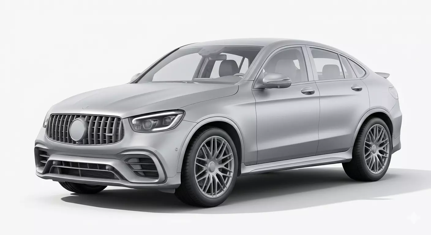 This 3D model features a highly detailed Mercedes-AMG GLC Coupe, showcased in a sleek metallic silver finish that highlights its athletic and aerodynamic silhouette. The rendering captures the vehicle's signature sloping roofline and aggressive front-end design, including the prominent Panamericana grille and large integrated air intakes. Detailed multi-spoke alloy wheels and precision-modeled LED headlight clusters add to the high-fidelity appearance of the asset. Set against a clean, studio-style white background, the model demonstrates excellent surface topology and realistic light play across its curved body panels. This digital model is an ideal resource for automotive visualization, architectural renders, or high-end product presentations where technical accuracy and modern luxury design are required.