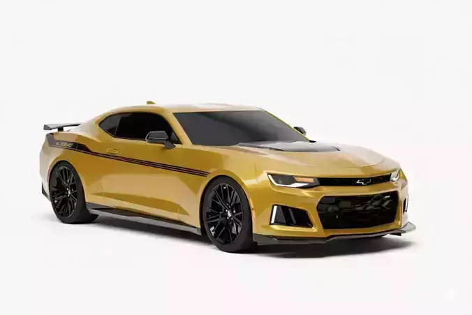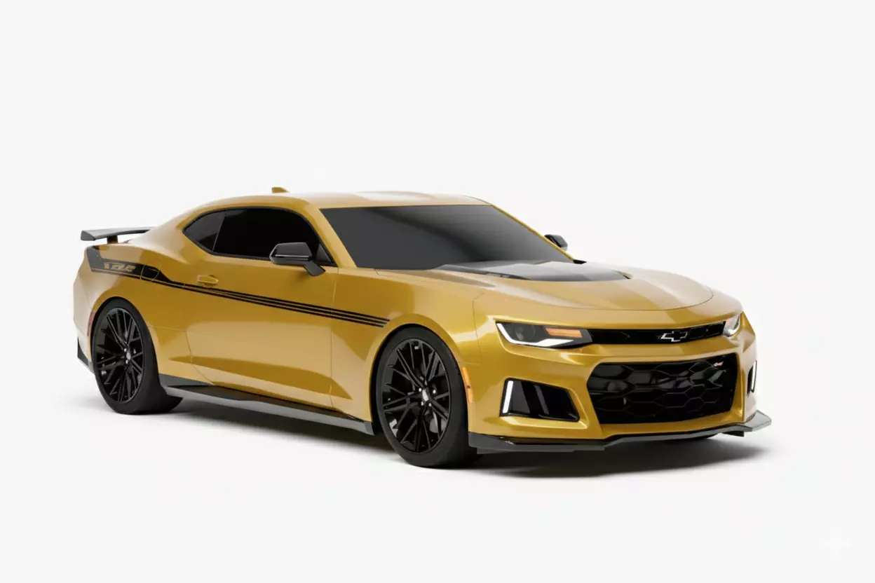 This 3D model depicts a powerful modern muscle car rendered in a striking metallic golden-yellow finish. The vehicle is equipped with a comprehensive performance kit, including a deep front splitter, side skirts, and a prominent black rear wing for enhanced downforce. Black racing stripes run along the side panels, complementing the tinted windows and large multi-spoke black alloy wheels. With its aggressive stance and high-fidelity textures, this model is perfectly suited for racing simulations, automotive marketing, or contemporary urban environment renders.