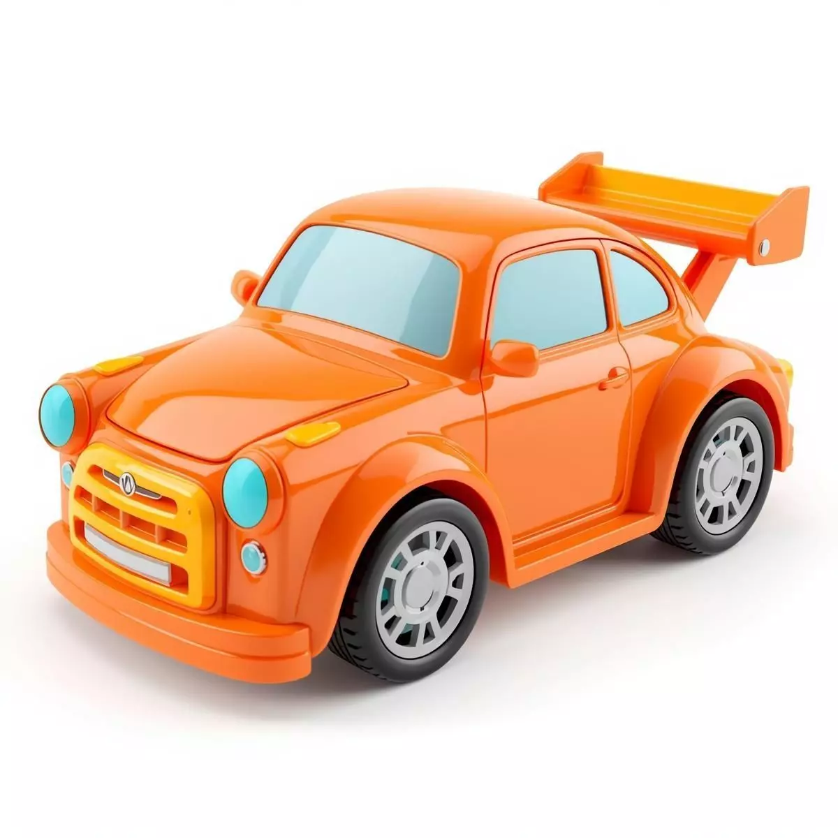 Tags3d model toy car orange sports car stylized vehicle game ready prop plastic texture chunky design kids toy racing car cyan windows rear spoiler glossy finish isolated asset miniature car decorative prop digital sculpture pbr materials playful design diecast style