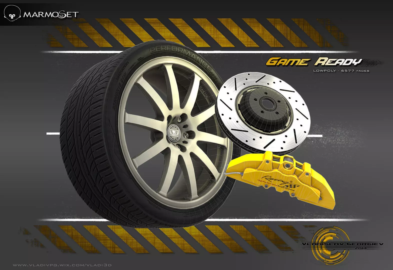 Low poly alloy wheel, car tire, brake caliper and disk. ******************************************************* - Polygon count: =============