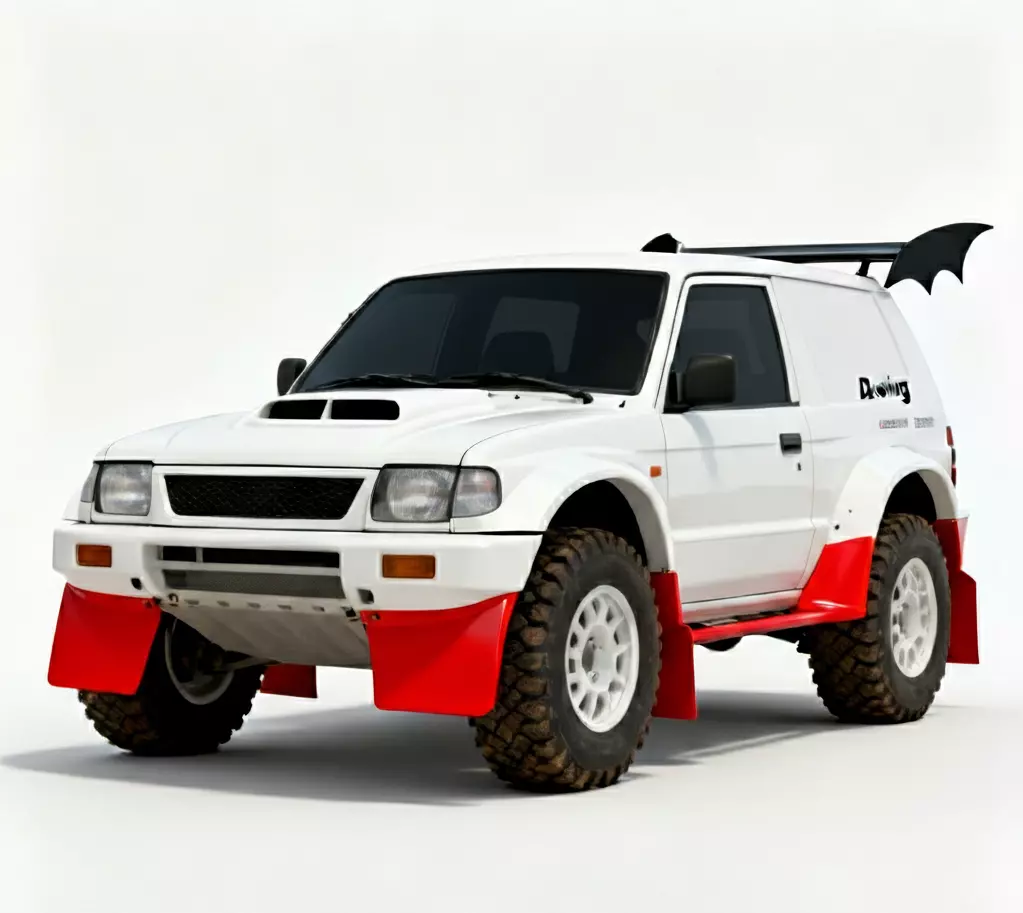 Stark White & Racing Red FinishThe main body features a clean, matte white finish that highlights the vehicle's aggressive lines. This is punctuated by vibrant racing red mudflaps and lower side skirts, providing a high-visibility look essential for rally environments.