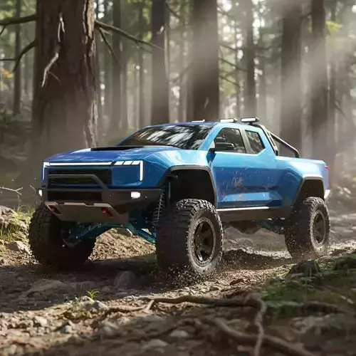 A rugged, high-clearance 4x4 pickup truck designed for off-road adventures. The vehicle features large all-terrain tires, reinforced suspension, and a sturdy roll cage. Shown navigating a forest trail with realistic dirt splashes and natural lighting. Perfect for game assets, 3D visualization, or automotive concept showcases.File Names:usdobjglb 3mf stlfbx