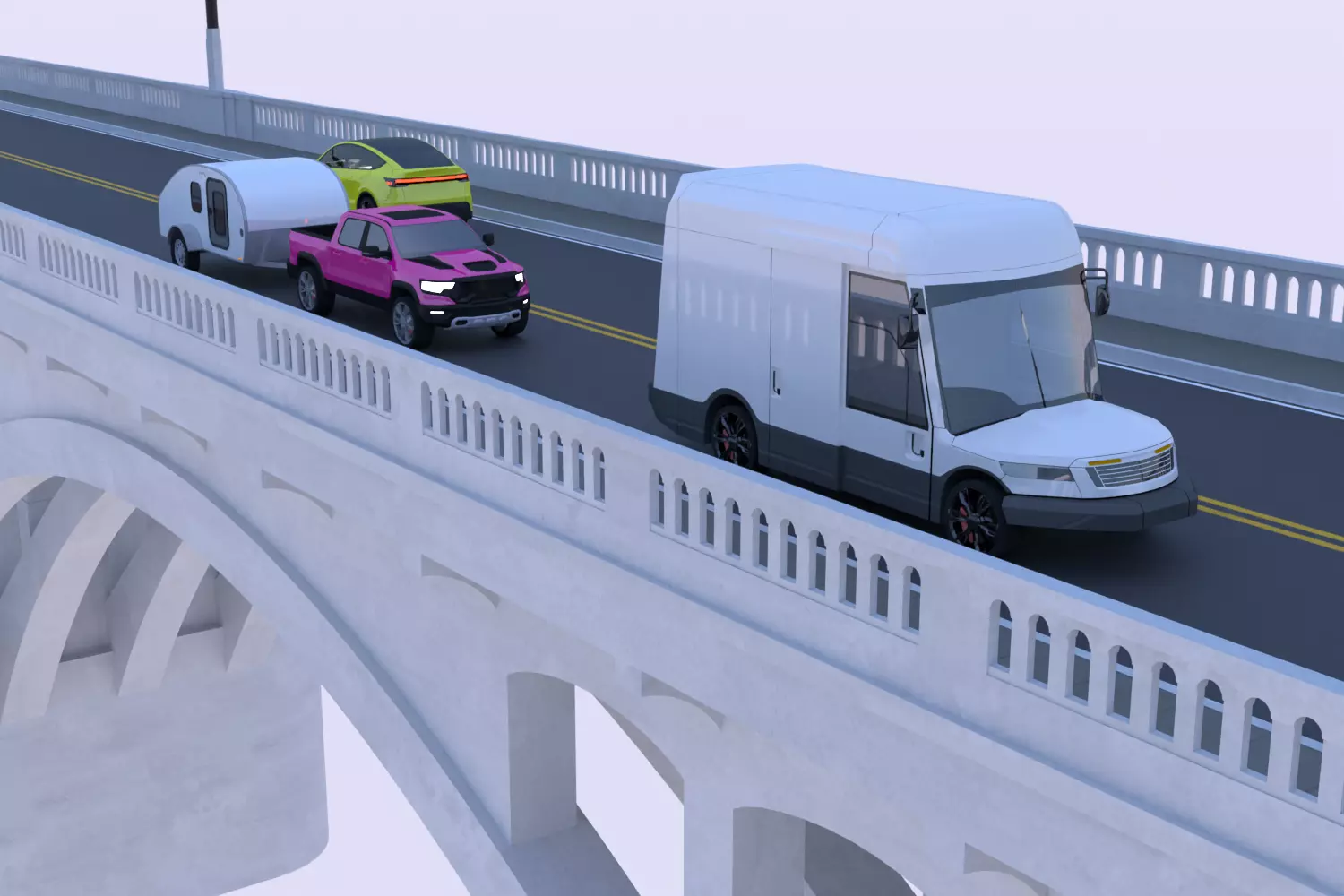 • This is 3D model of bridge with Dodge RAM car with caravan, Oshkosh van and Tesla Juniper.