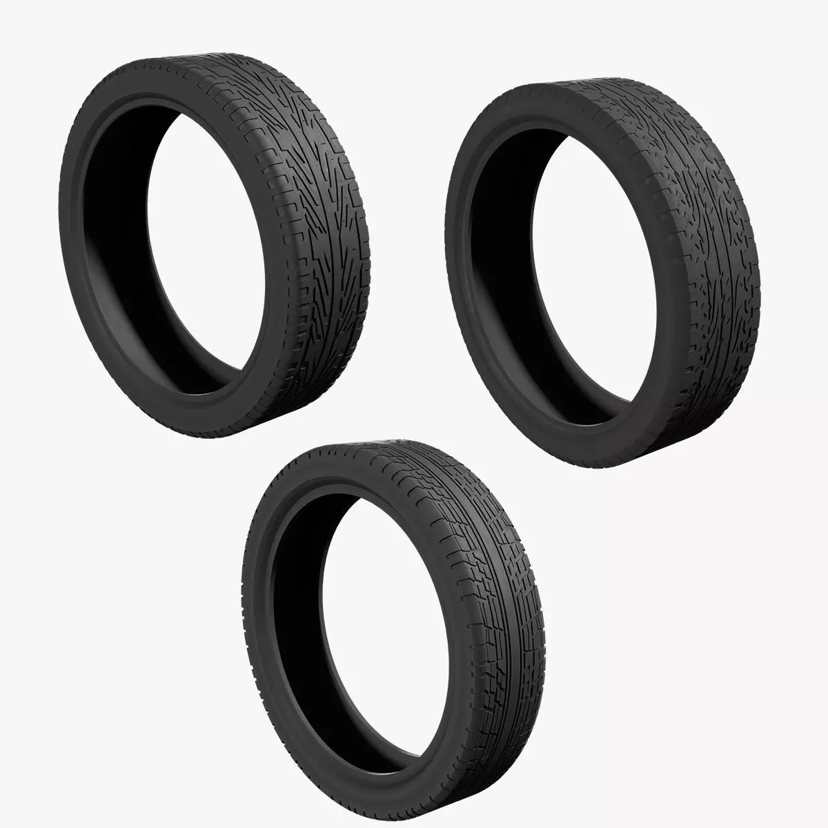 A set of three Car Tires, made from PBR materials with a Hig polygon count, ideal for high-performance scenes, renders and style.