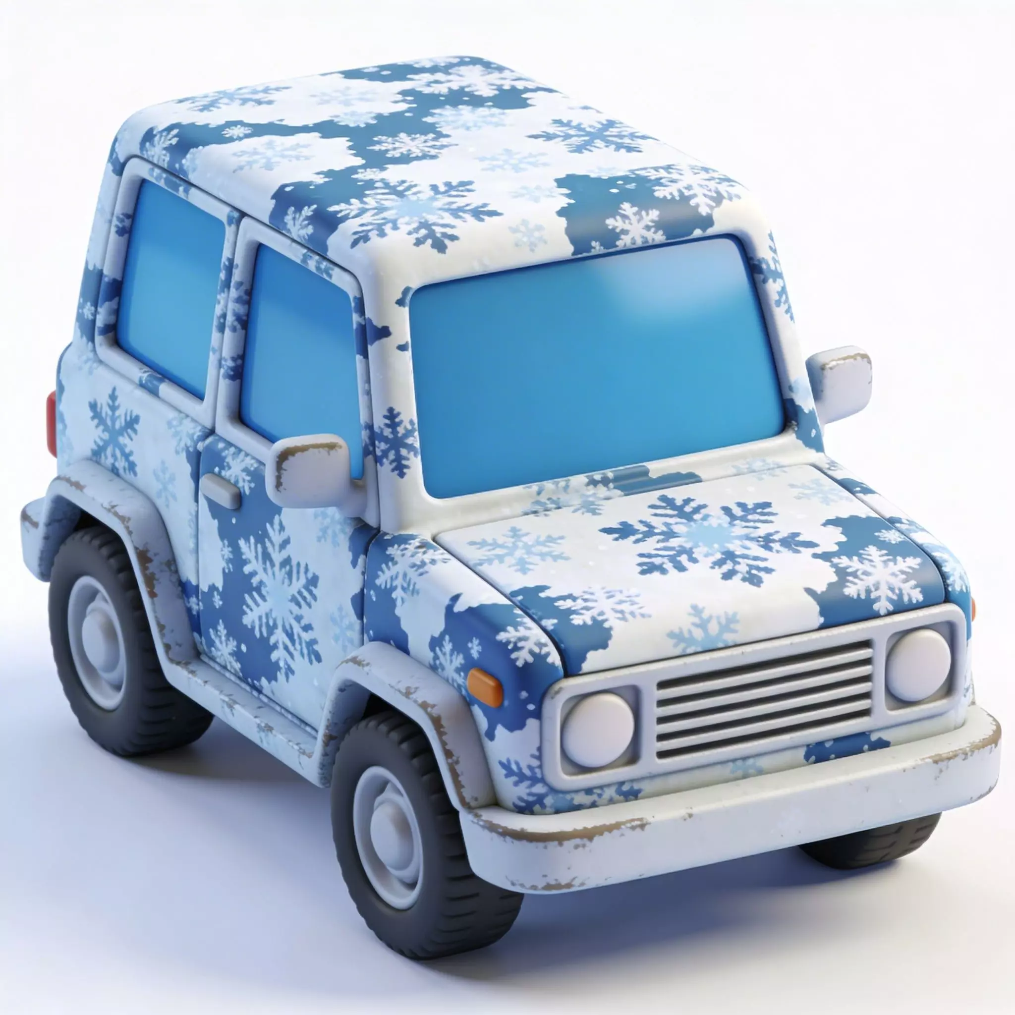 The Chibi Stylized Snowflake SUV is a delightful 3D model designed with a charming winter theme. The vehicle features a boxy, compact body decorated with a festive pattern of large blue and white snowflakes over a light blue base. Its design incorporates soft, rounded edges and simplified features such as large circular headlights and solid blue windows, giving it a friendly, toy-like appearance. Subtle weathering and dirt accumulation around the wheel wells and lower bumpers suggest a vehicle that has been adventuring through snowy terrains. Sitting on chunky black tires with white rims, this stylized scout is an ideal asset for winter-themed adventure games, holiday-inspired mobile apps, or as a unique digital collectible.