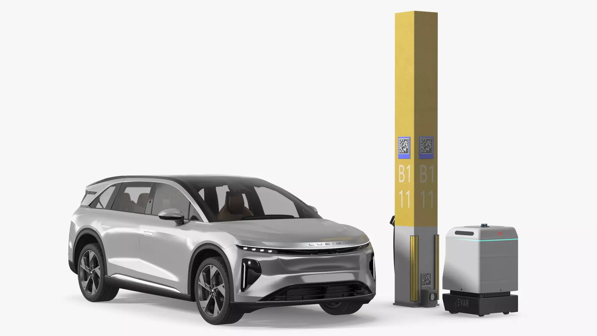 EVAR Parky Charging Robot with Car Lucid Gravity is a 3D model of an advanced electric vehicle (EV) charging robot paired with a sleek, modern Lucid Gravity car.