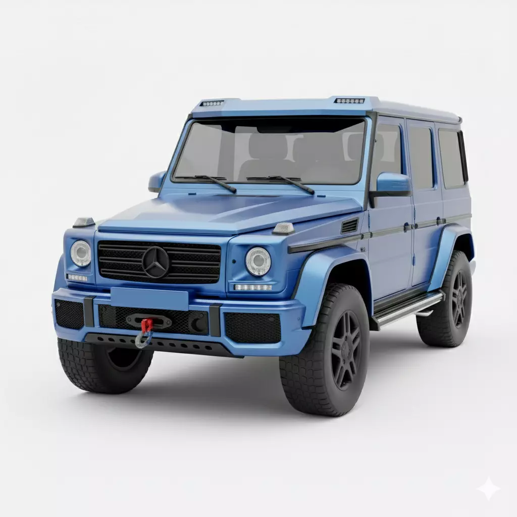 This is a high-quality 3D model of a modern luxury off-road SUV, heavily inspired by the iconic, boxy silhouette of a Mercedes-Benz G-Class. The vehicle is finished in a sleek metallic blue and features a range of rugged enhancements, including a front-mounted winch with a red hook, integrated LED daytime running lights, and a subtle roof-mounted light bar. Its aggressive stance is complemented by wide fender flares and blacked-out multi-spoke wheels, blending high-end urban style with genuine off-road capability. This detailed digital asset is ideal for automotive visualizations, modern city environments, or as a premium drivable vehicle in contemporary video games.