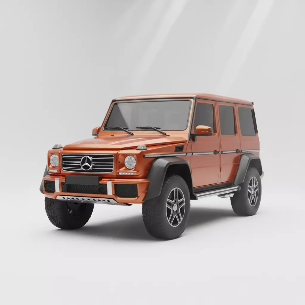 This is a high-fidelity 3D model of the Mercedes-Benz G-Class, specifically the extreme 4x4² variant, which blends legendary luxury with unmatched off-road capability. Rendered in a sophisticated copper-orange metallic finish, the model meticulously captures the vehicle's iconic boxy silhouette and rugged design cues. Key features include the signature circular LED headlights, a prominent chrome three-pointed star on the grille, and wide-body carbon fiber wheel arches that house massive all-terrain tires. The model showcases a high-clearance suspension setup, protective underbody skid plates, and side-exit exhaust tips, all rendered with realistic material shaders. This professional-grade asset is perfect for luxury lifestyle visualizations, high-end automotive commercials, and realistic open-world gaming environments.