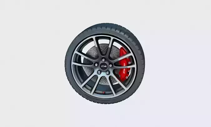 This modern car wheel 3D model features a detailed alloy rim, high-performance tire, and a ventilated brake disc paired with a red brake caliper.Visible lug nuts and a carefully modeled tire tread pattern enhance realism and mechanical accuracy.