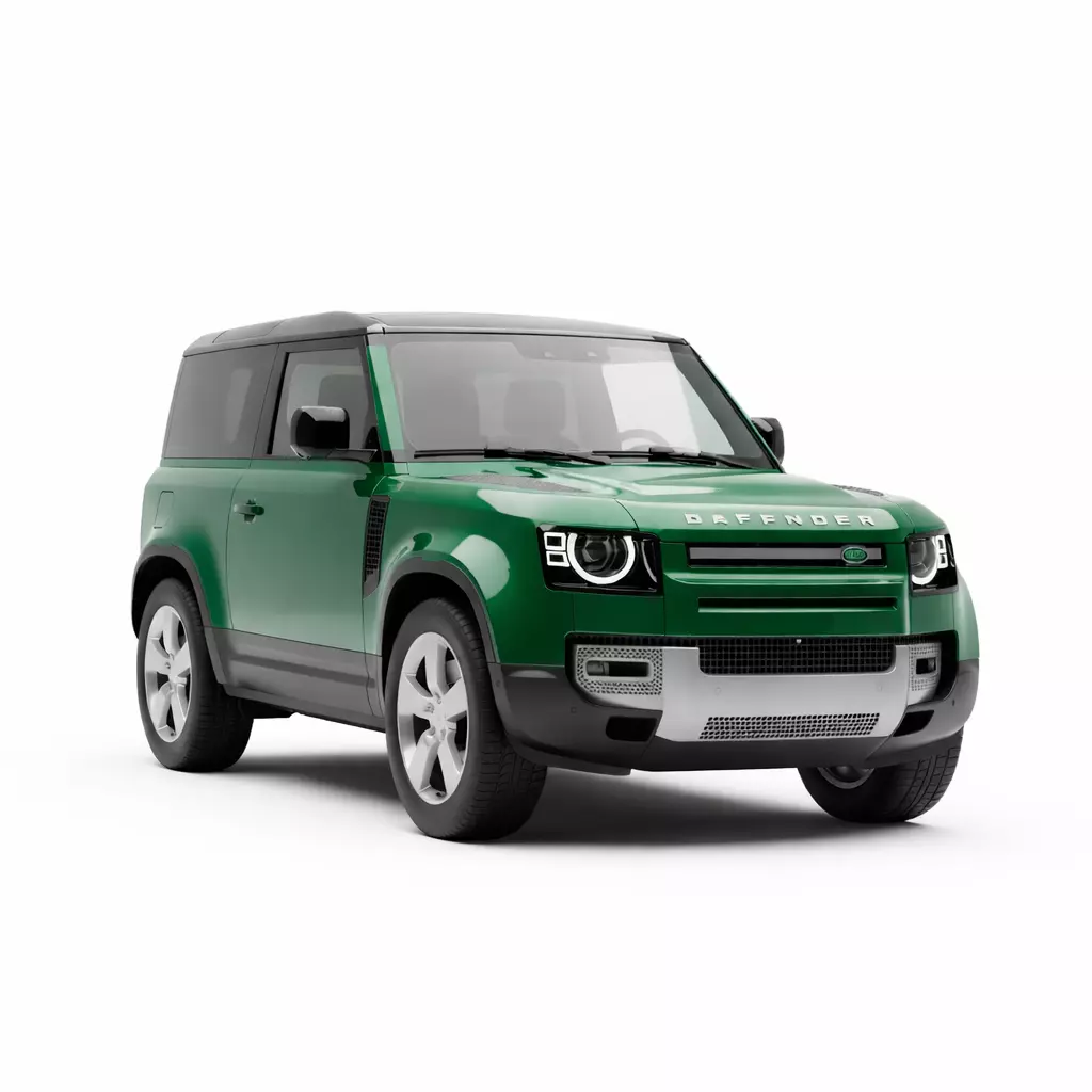 This is a high-quality 3D model of a modern compact off-road SUV, heavily inspired by the current generation Land Rover Defender 90. The vehicle is finished in a glossy forest green with a contrasting black panoramic roof and dark grey lower body cladding. Its design features a mix of rugged utility and sleek modernism, highlighted by distinctive circular LED daytime running lights, a prominent DEFENDER badge on the hood, and a silver-finished front skid plate. The model is rendered with precise geometry and realistic materials, capturing the vehicle's short wheelbase and purposeful stance. This asset is ideal for high-end architectural visualizations, automotive marketing, or as a premium vehicle in a modern-day game environment.