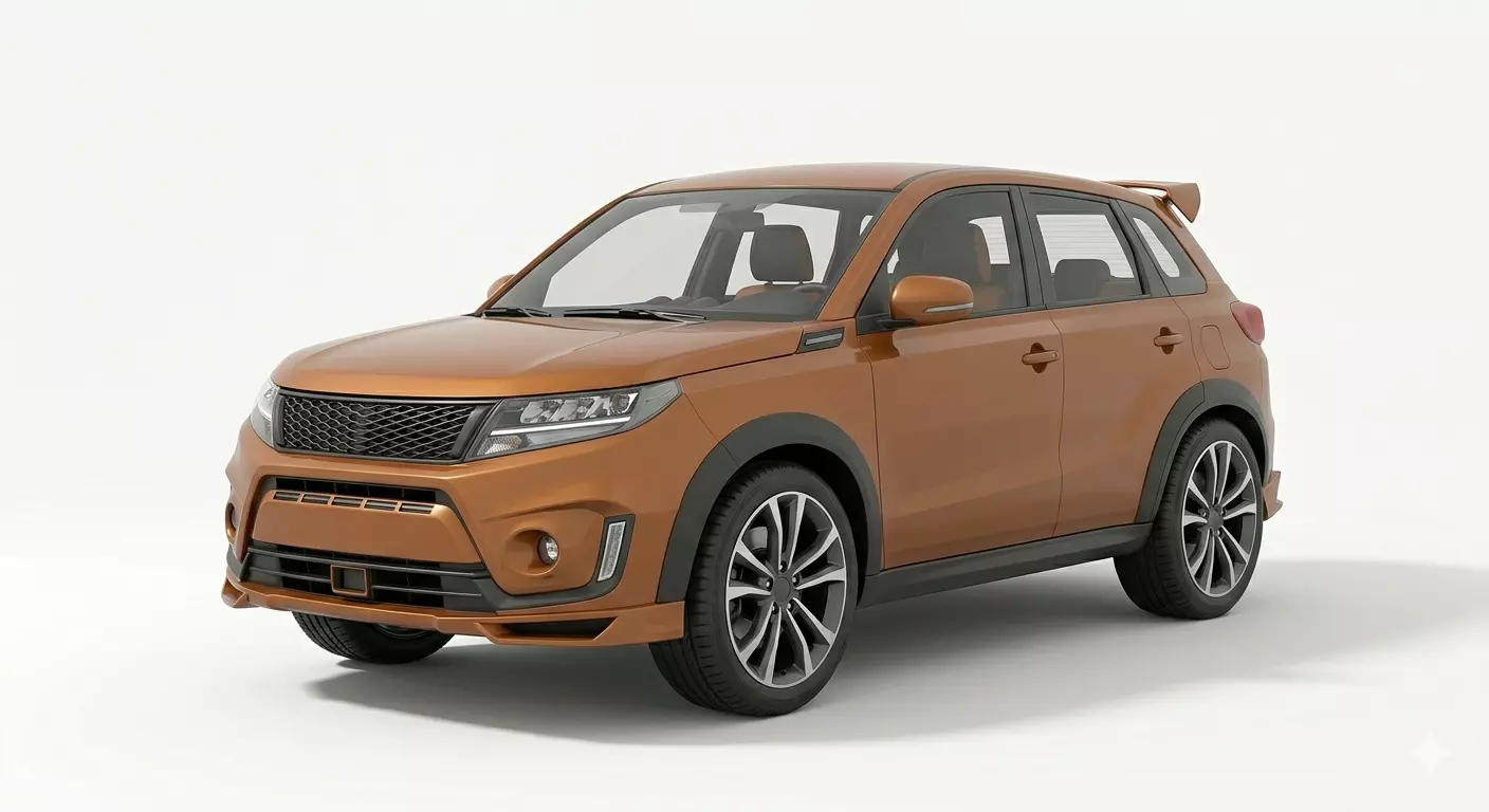 This 3D model features a modern compact SUV, showcased in a vibrant metallic orange finish that highlights its versatile and contemporary design. The model captures a sporty yet practical silhouette, featuring a bold front honeycomb grille, sleek LED headlight clusters, and integrated fog lights. Functional aesthetic elements include blacked-out wheel arches, side skirts, and a subtle rear roof spoiler that adds a touch of athletic flair. The vehicle is equipped with high-detail multi-spoke alloy wheels and low-profile tires, emphasizing an urban-ready stance. Set against a clean, studio-style white background, the rendering exhibits smooth surface topology and realistic material properties, making it an excellent asset for automotive visualization, urban environment renders, and digital marketing materials.