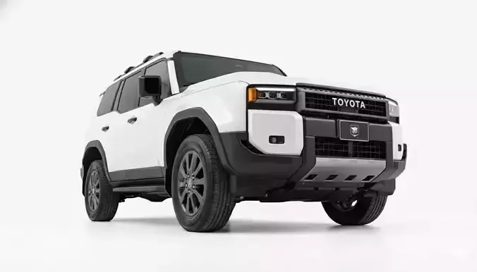This is a contemporary 3D model of a rugged, off-road-focused SUV, likely inspired by recent Toyota concepts or the Land Cruiser heritage, featuring a boxy, muscular design. The vehicle is finished in clean white and contrasted heavily with matte black plastic cladding around the wheel arches, front bumper, and grille, emphasizing its durability. Key design features include a bold, horizontally-themed grille with the TOYOTA lettering, stacked headlight units, and a prominent silver/gray skid plate on the lower front fascia. This modern and aggressive asset is ideal for current-day game environments, advertising, or visualizations requiring a tough, capable, and fashionable utility vehicle.
