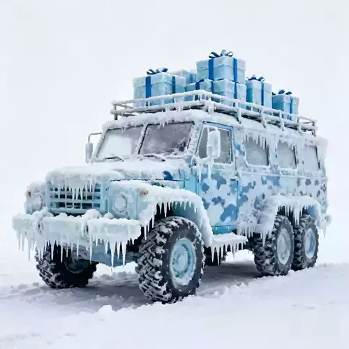 Frozen Flash-Freeze Detail The most defining feature is the extreme icing. The entire chassis is encrusted with thick frost, and long, sharp icicles hang from the front bumper, wheel wells, and roof rack. This gives the asset a frozen in time look, suggesting it has been braving a blizzard for days.