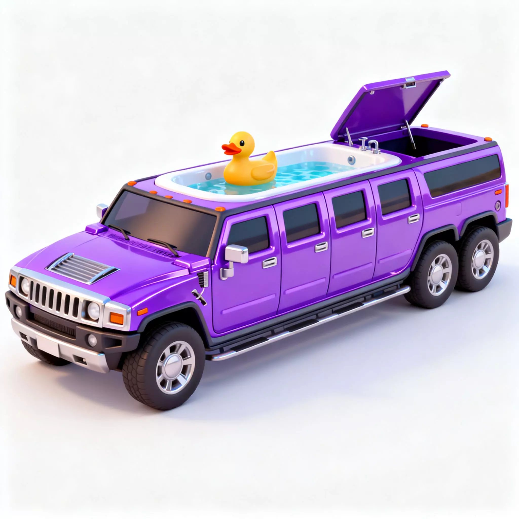 The Overall Concept This model reimagines a rugged 6x6 stretch SUV as the ultimate mobile party machine. By replacing the traditional armored roof with an open-air hot tub, it transforms a serious military-style vehicle into a comical, high-status leisure asset.