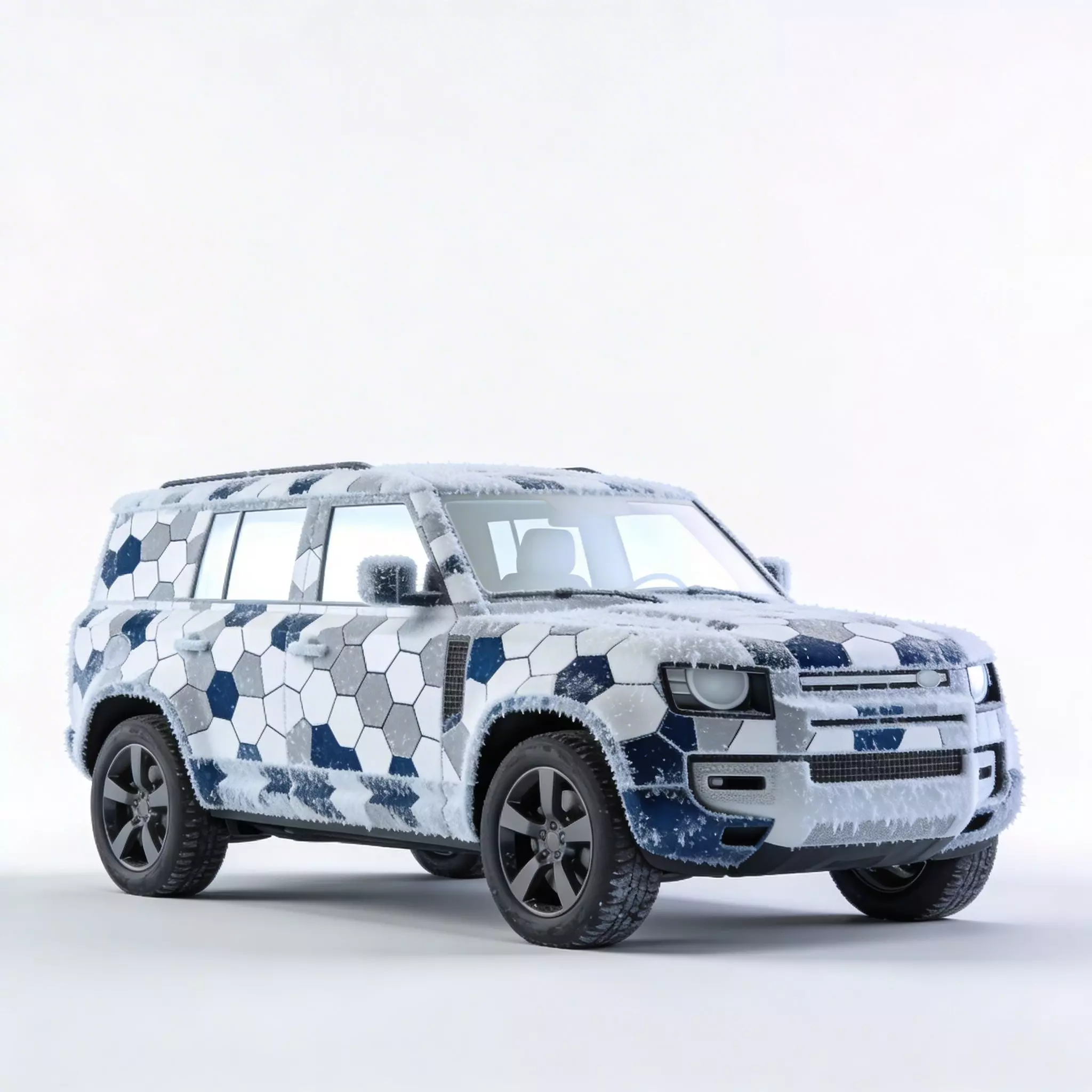 The Realistic Sci-Fi Arctic SUV is a high-fidelity 3D model designed for elite reconnaissance in extreme sub-zero environments. The vehicle features a striking geometric hexagonal camouflage pattern in shades of navy blue, slate grey, and white, optimized for stealth in icy landscapes. This model is meticulously detailed with a layer of hyper-realistic frost and snow accumulation across the hood, roof, and bumpers, enhancing its cold-weather authenticity. Built on a modern, robust SUV frame with high-clearance black alloy wheels, it combines contemporary automotive design with futuristic tactical aesthetics, making it a perfect centerpiece for arctic expeditions, winter military simulations, or cinematic sci-fi projects.