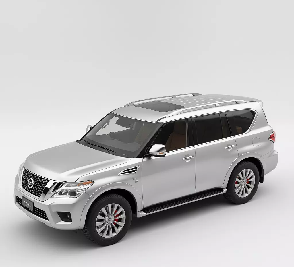 This stunning silver Nissan Patrol is captured in a series of professional studio shots, highlighting its imposing presence and luxurious off-road capability. The full-size SUV is showcased from multiple angles—including the dominant front fascia with its bold grille and squared-off headlamps, the muscular rear with updated taillight clusters, and dynamic three-quarter views. Its classic silver finish emphasizes the vehicle's rugged yet refined design aesthetic. Key features visible across the images include the integrated roof rails, a sunroof, stylish multi-spoke alloy wheels, and a subtle V8 badge signifying its powerful performance. The interior, visible through the windows, boasts rich, tan leather upholstery, suggesting a focus on premium comfort. This model perfectly balances a family-friendly, spacious cabin with the legendary Patrol off-roading heritage, making it an ideal choice for both urban commuting and adventurous excursions. It stands as a testament to Nissan's engineering, offering a commanding, confident, and sophisticated driving experience.